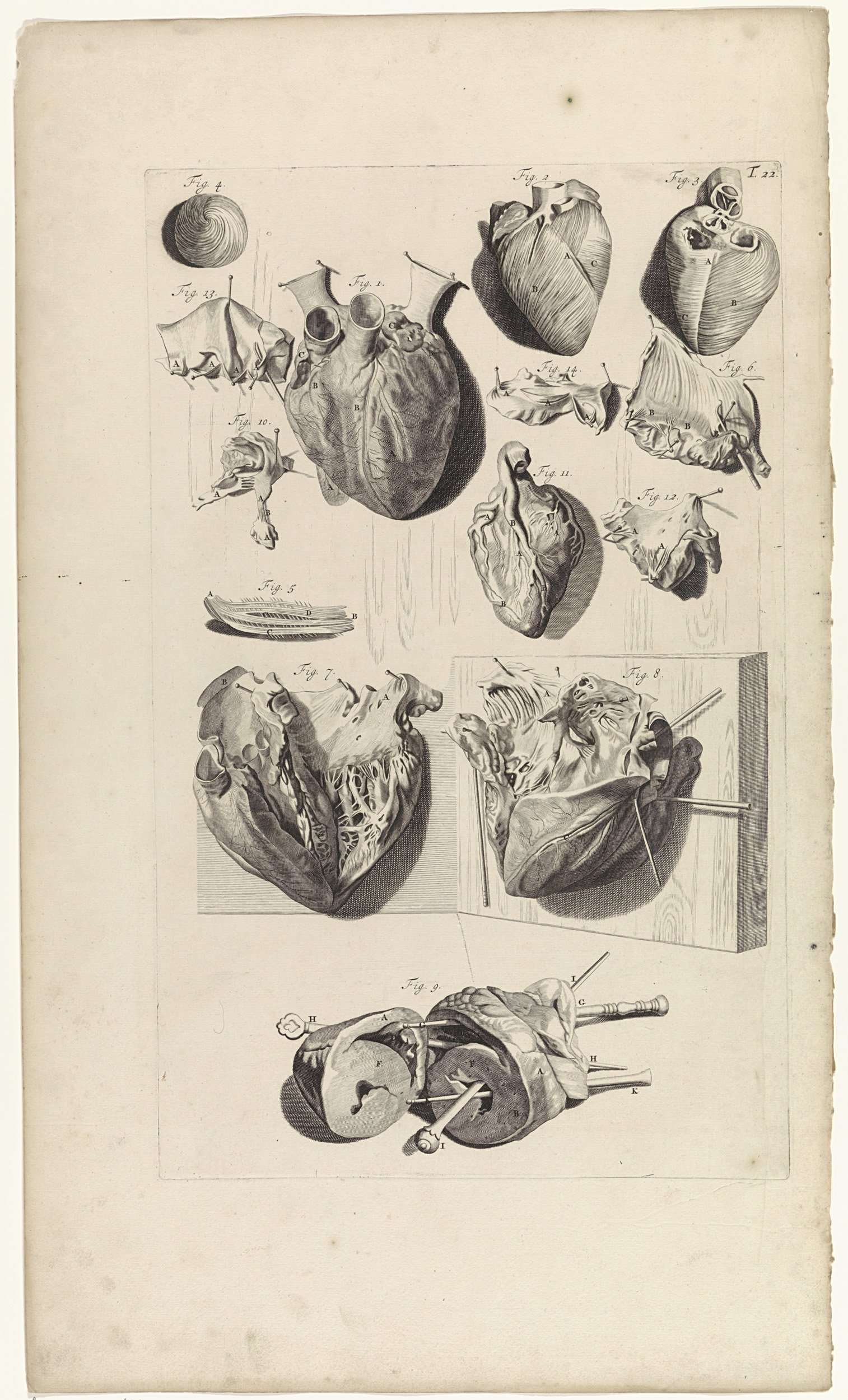 Anatomische studie van het hart met dissectie van de hartkamers. Bovenaan rechts genummerd T. 22.