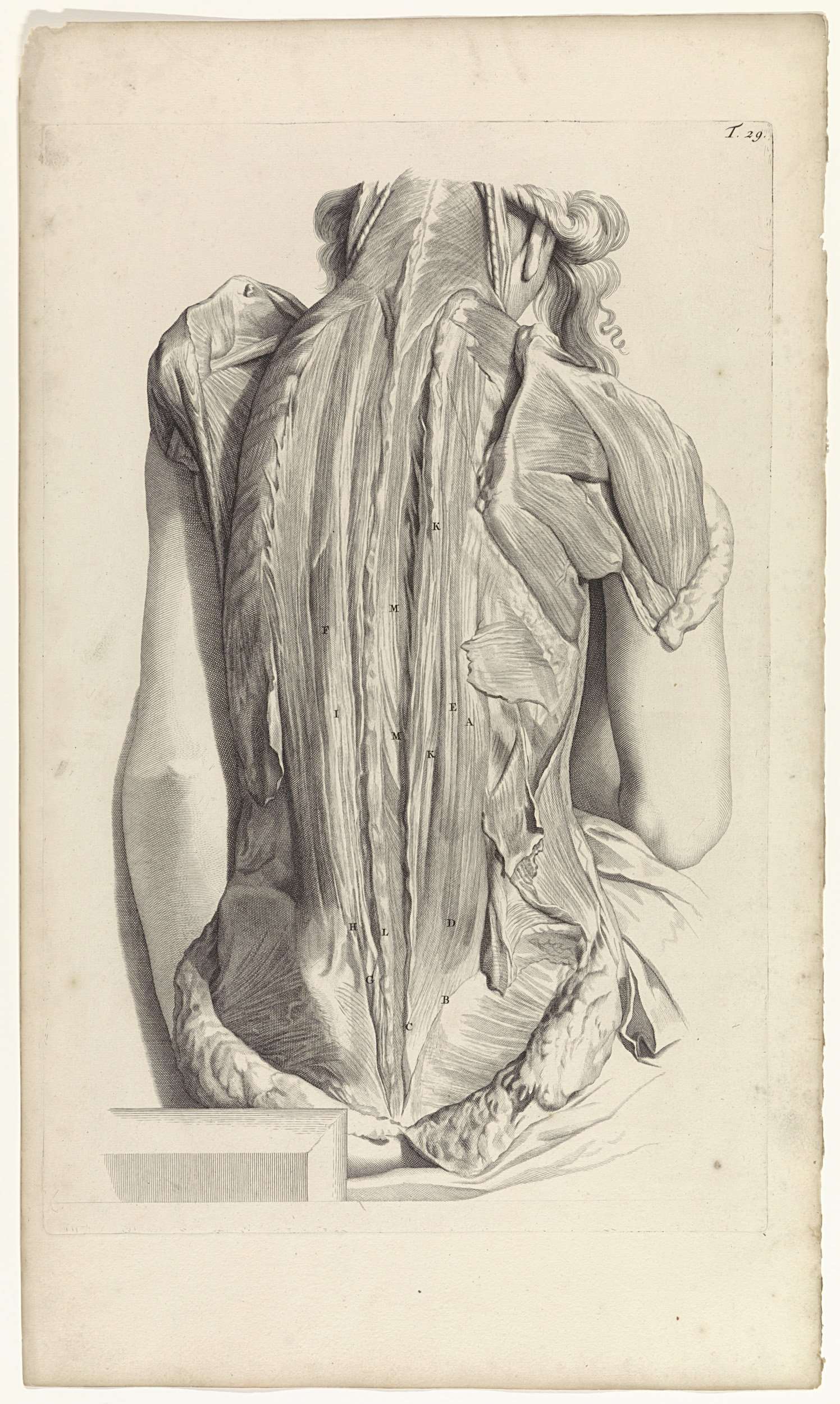 Anatomische studie van de spieren van de rug en de bovenarmen van een vrouw. Bovenaan rechts genummerd T. 29.