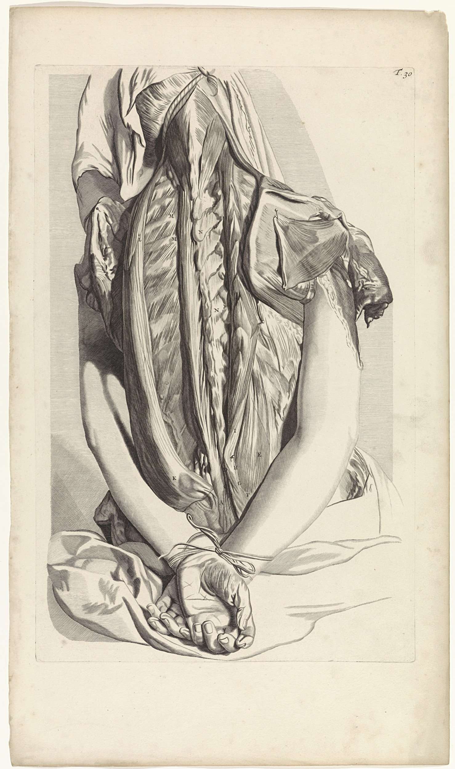 Anatomische studie van de spieren van de rug en de bovenarmen van een vastgebonden vrouw. Bovenaan rechts genummerd T. 30.