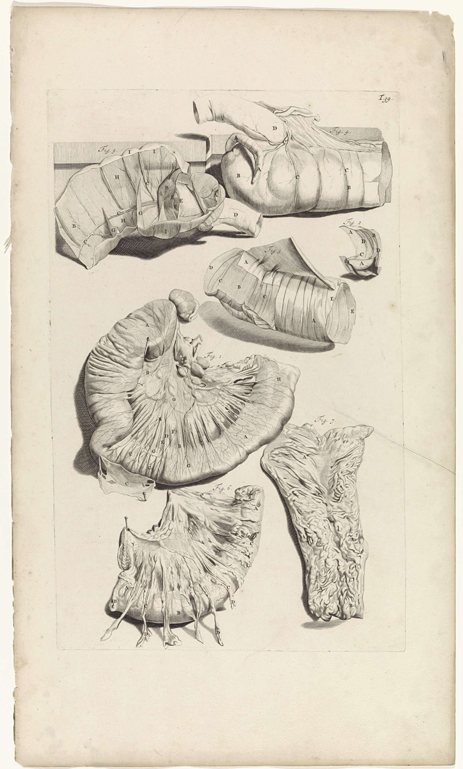 Anatomische studie en dissectie van de blinde darm. Bovenaan rechts genummerd T. 39.