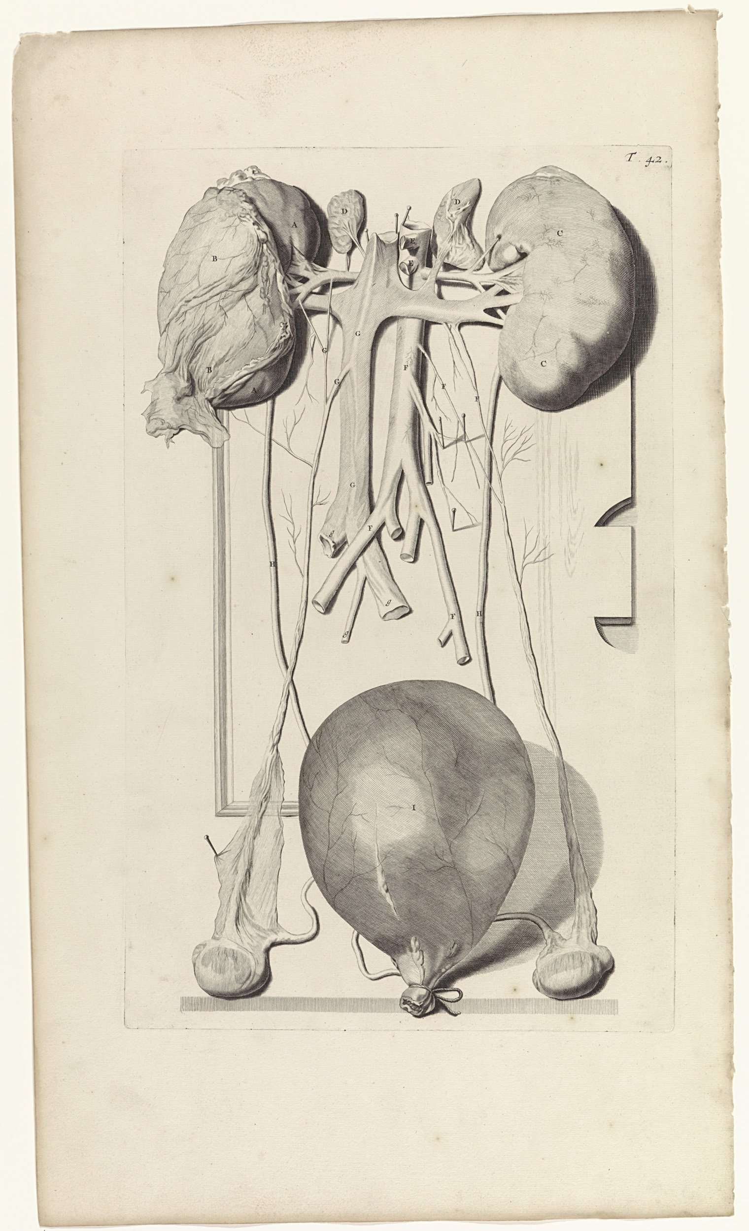 Anatomische studie van het urinestelsel, met nieren, blaas en teelballen. Bovenaan rechts genummerd T. 42.
