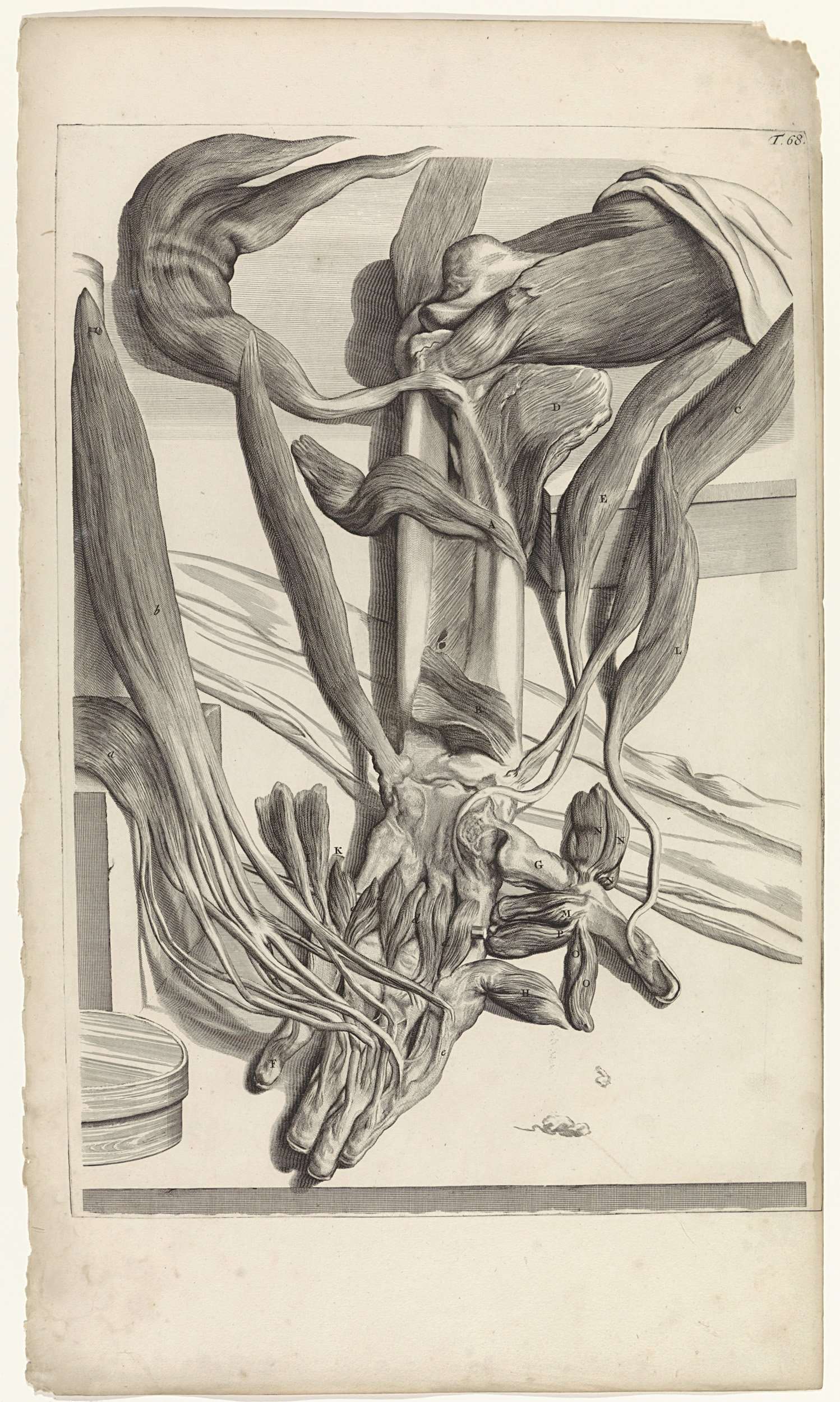 Anatomische studie en dissectie van de spieren en de beenderen van de linkeronderarm en de hand. Bovenaan rechts genummerd T. 68.