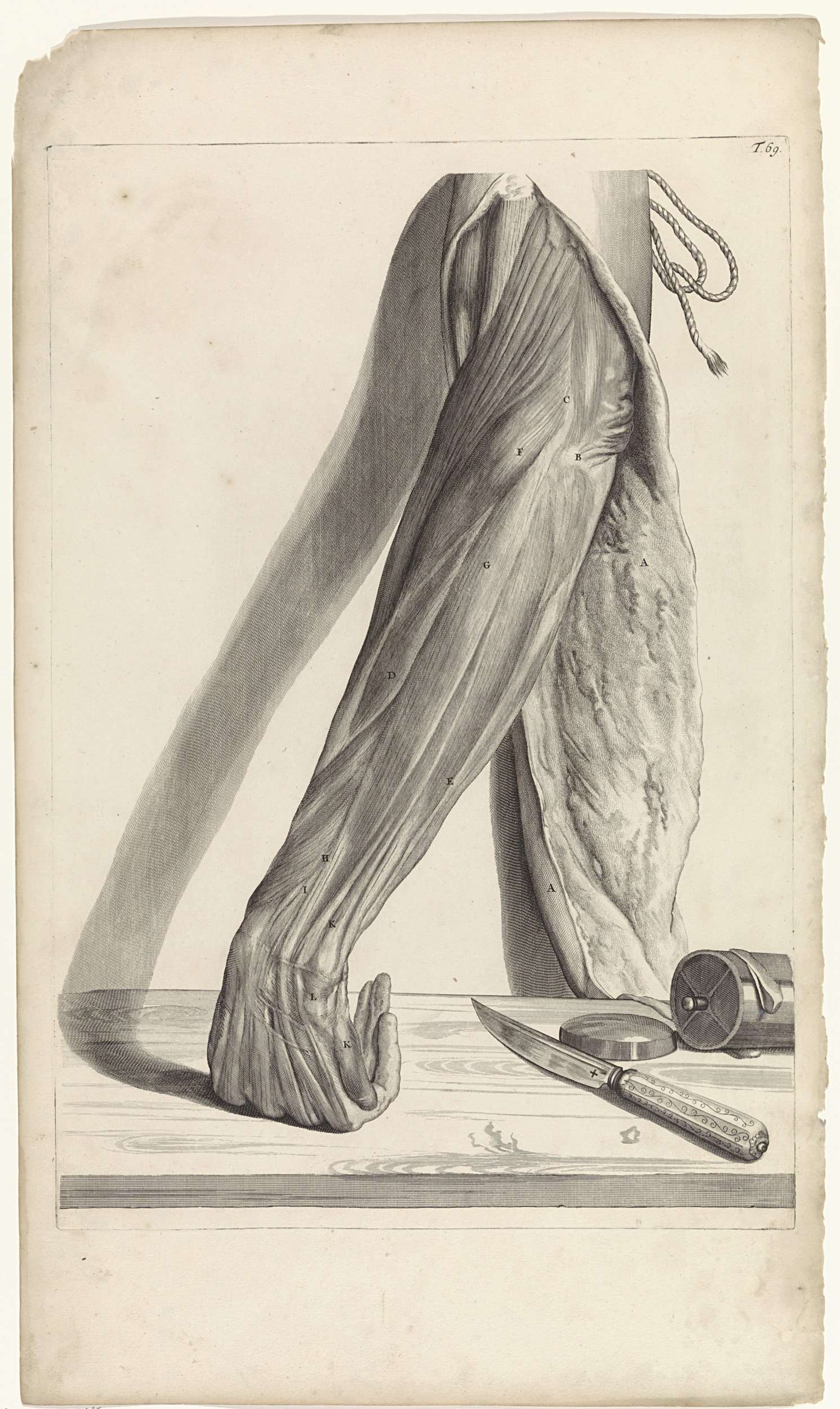 Anatomische studie van een gevilde linkeronderarm. Bovenaan rechts genummerd T. 69.