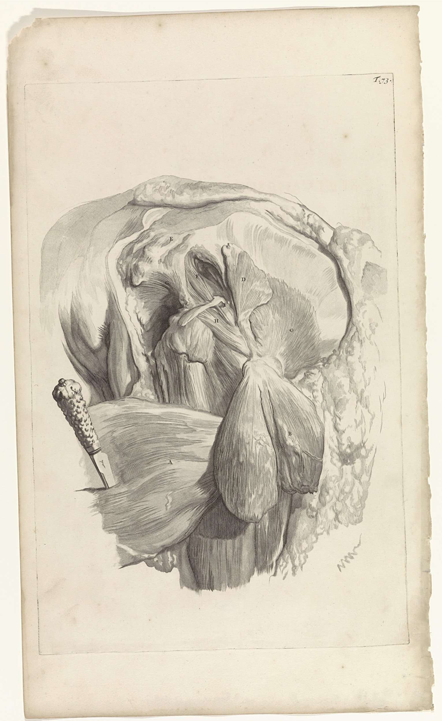 Anatomische studie en dissectie van de spieren van het linkerdijbeen en de heup. Bovenaan rechts genummerd T. 73.
