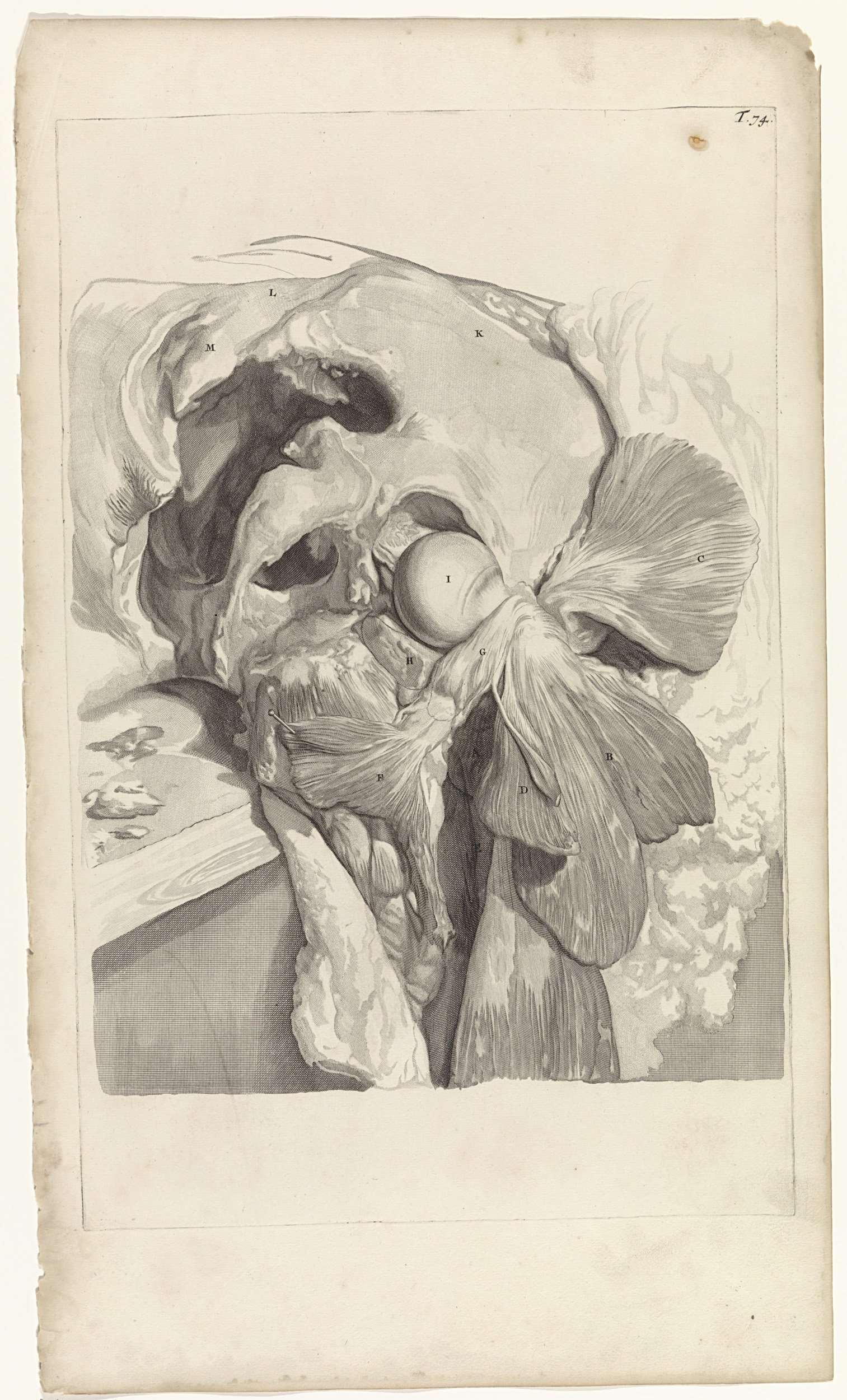 Anatomische studie van de heup en de spieren en het bot (femur) van het linkerdijbeen. Bovenaan rechts genummerd T. 74.