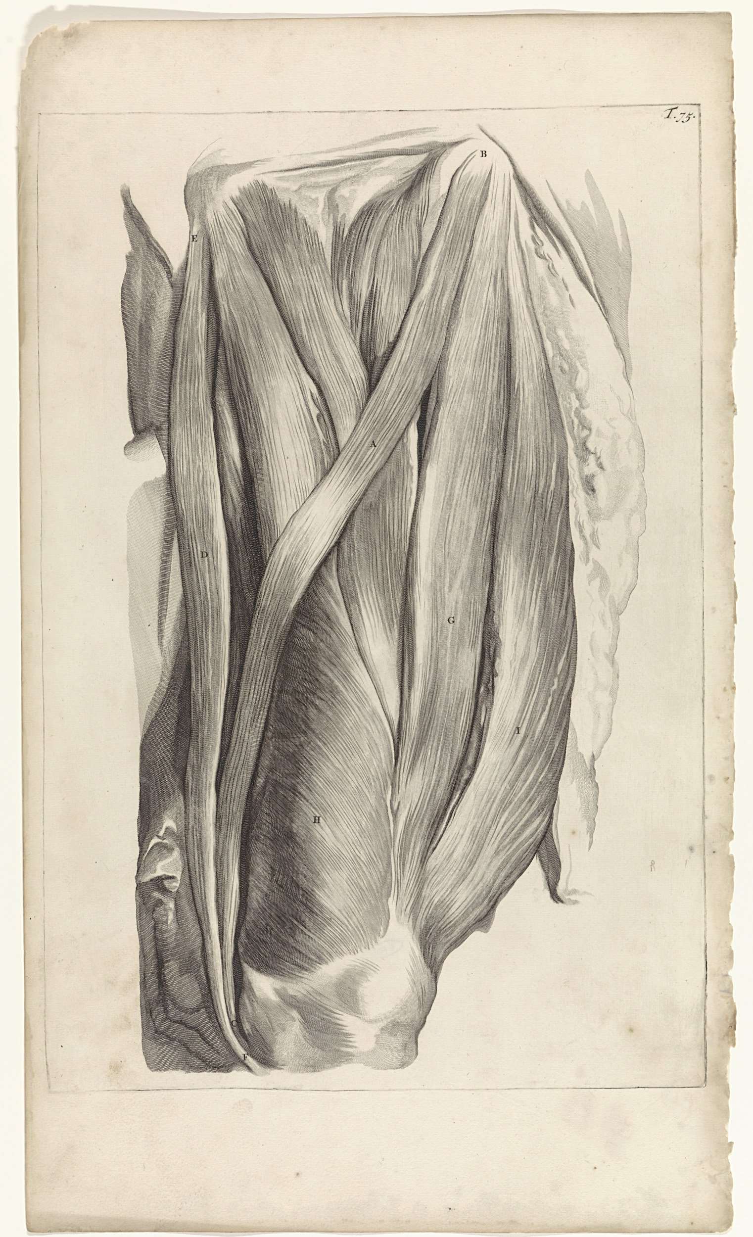Anatomische studie van de spieren van het linkerdijbeen tot aan de knie. Bovenaan rechts genummerd T. 75.