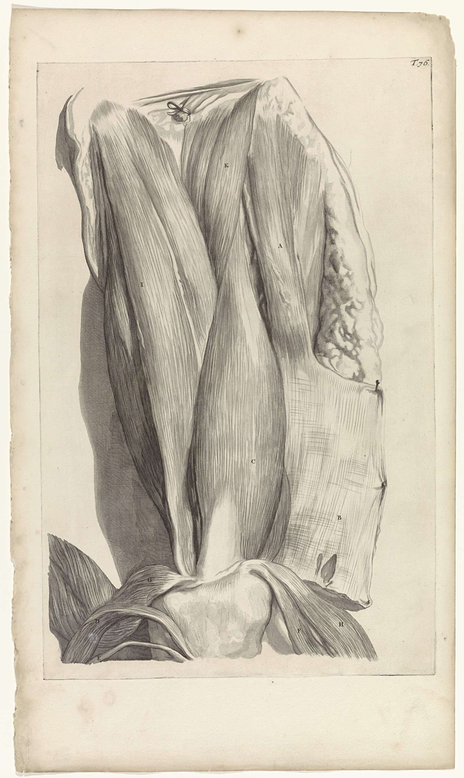 Anatomische studie van de spieren van het linkerdijbeen tot aan de knie. Bovenaan rechts genummerd T. 76.