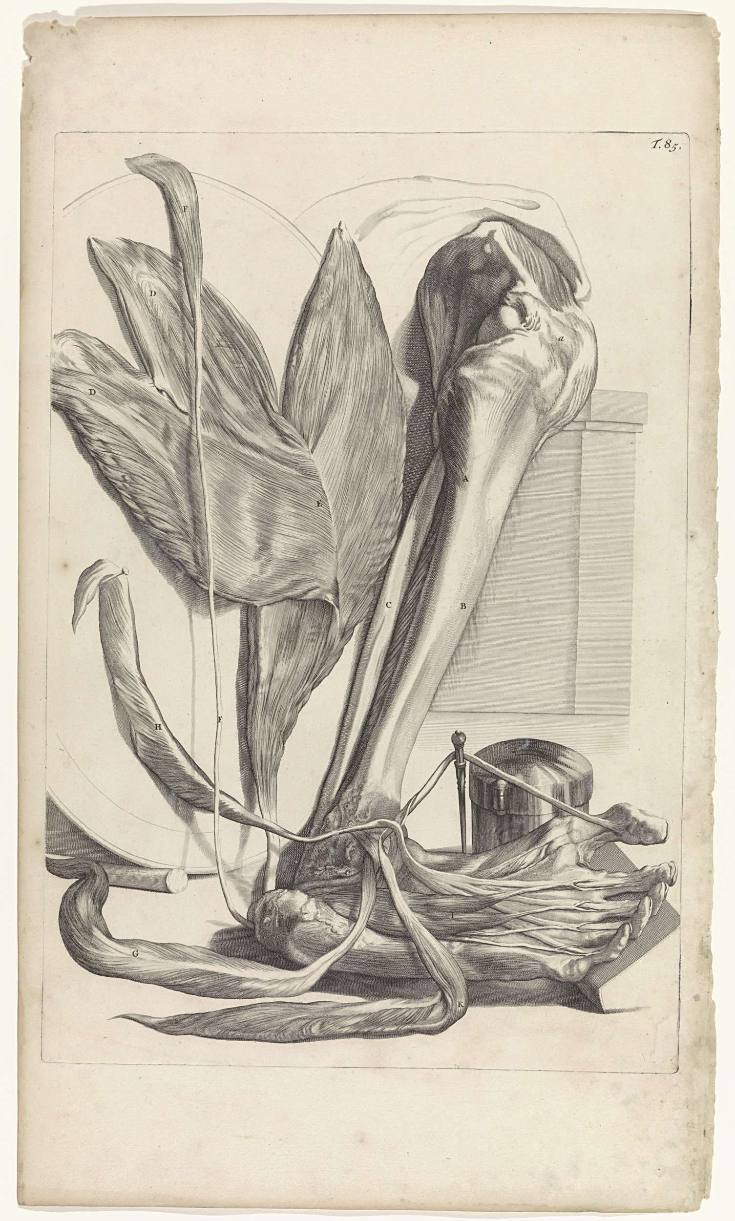 Anatomische studie van de onderkant van de linkervoet en de daar liggende spieren en pezen. Bovenaan rechts genummerd T. 85.