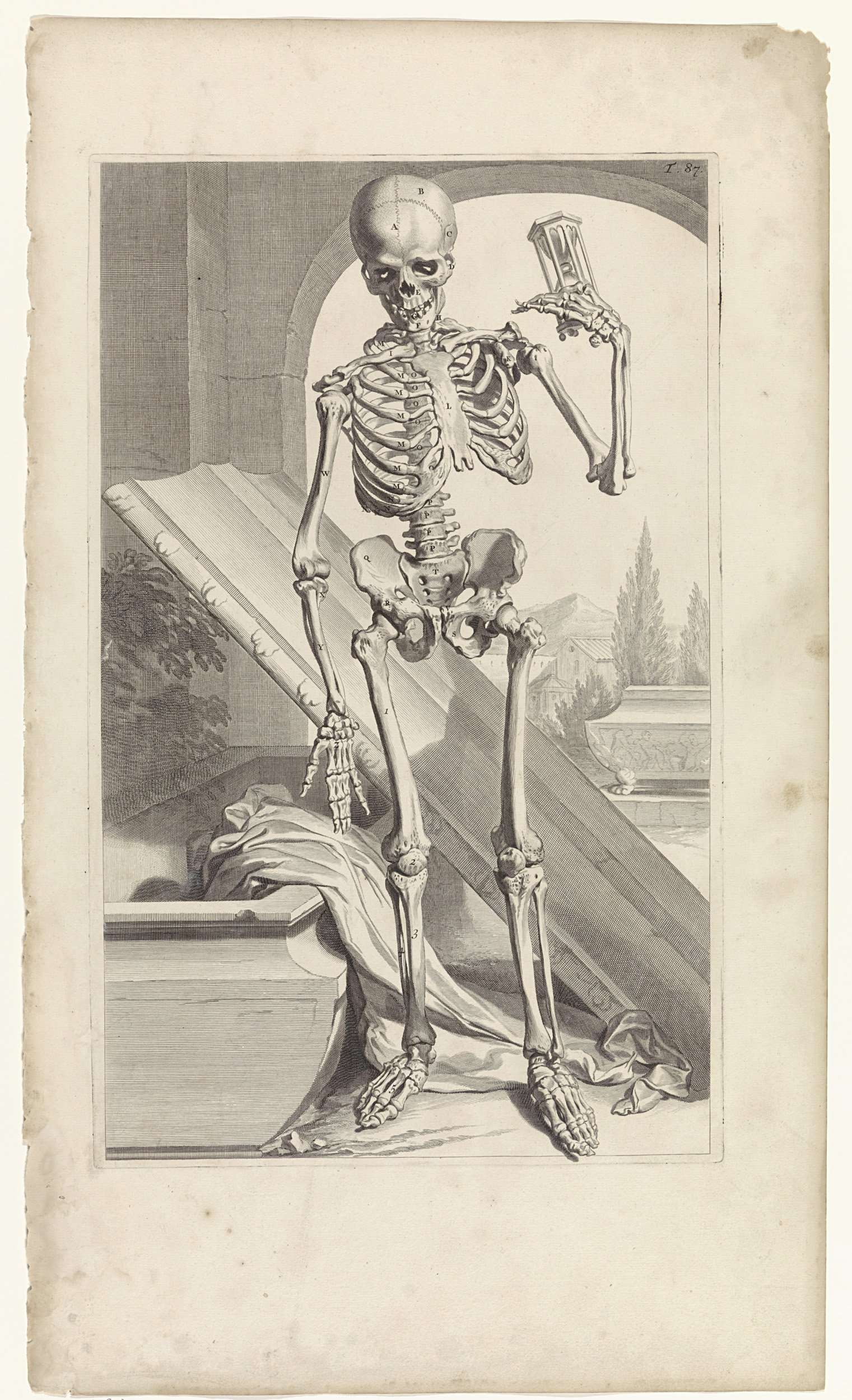 Anatomische model van een menselijk skelet. In zijn linkerhand een zandloper. Naast hem een graf. Bovenaan rechts genummerd T. 87.