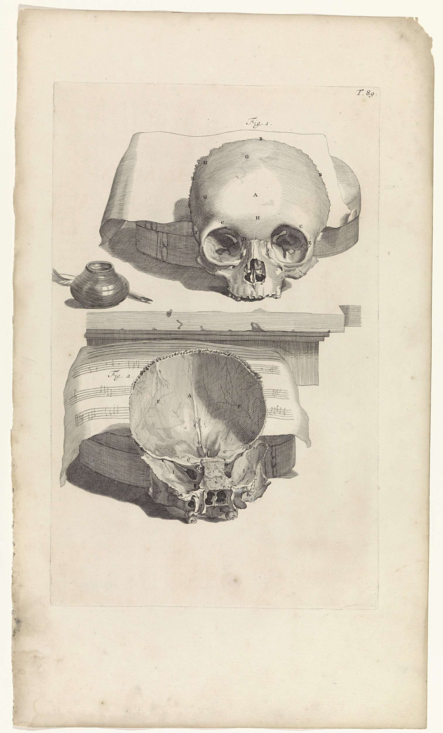 Anatomische studie van de voor- en binnenkant van een schedel. Achter de schedel een muziekblad. Bovenaan rechts genummerd T. 89.