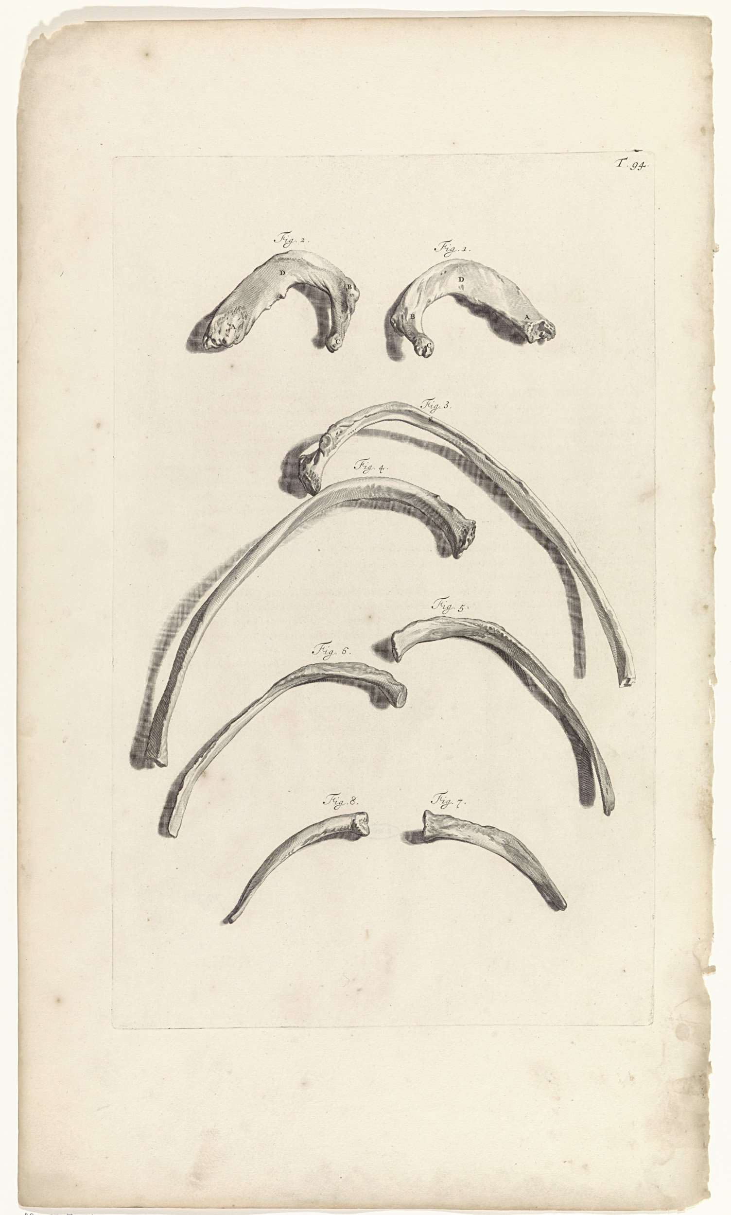 Anatomische studie van de ribben. Bovenaan rechts genummerd T. 94.