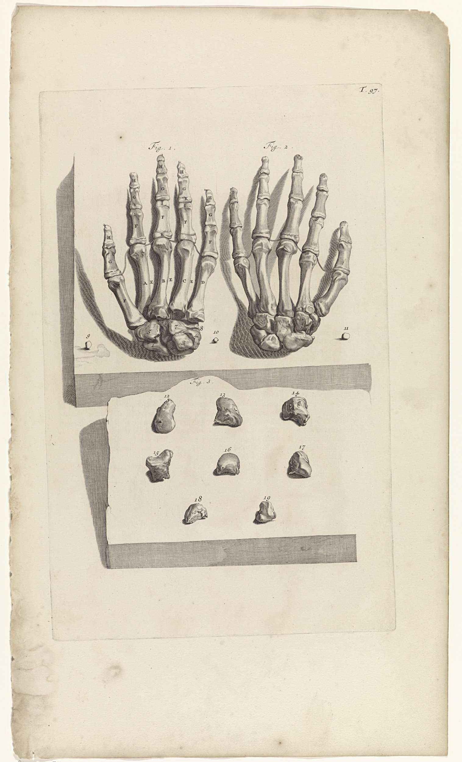 Anatomische studie van de beenderen van de handen. Bovenaan rechts genummerd T. 97.
