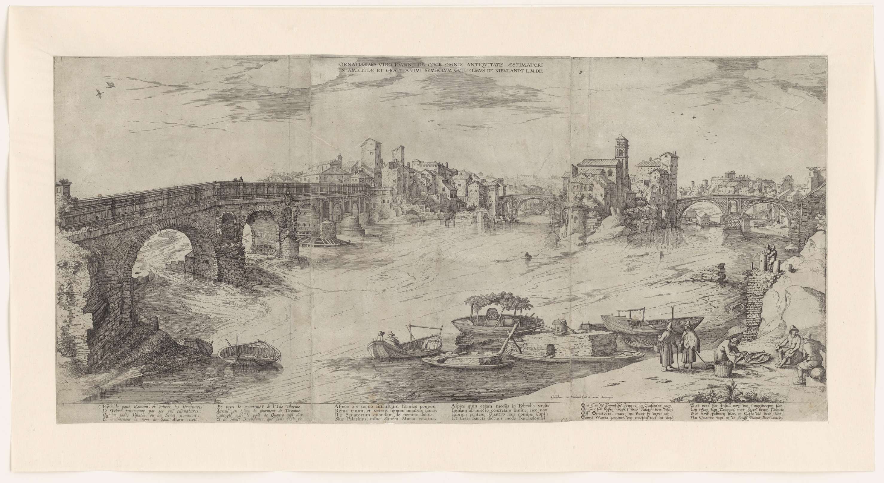 Gezicht op de rivier de Tiber in Rome. Rechts het Tibereiland. Links een brug en op de voorgrond verschillende sloepen. Rechts enkele mensen op de oever. Onderaan in de marge twee vierregelige verzen in het Frans, twee vierregelige verzen in het Latijn en twee vierregelige verzen in het Nederlands.