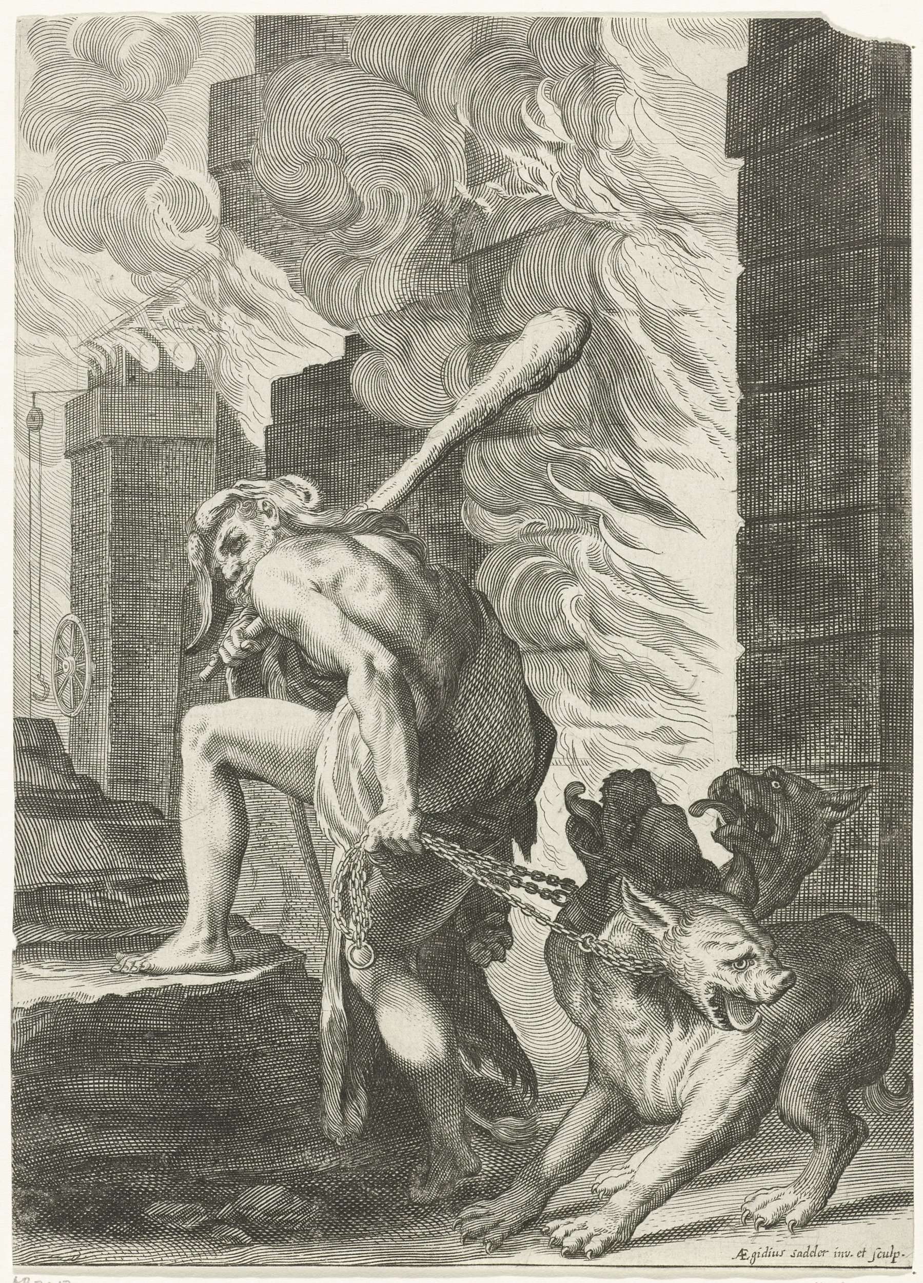 Hercules in de onderwereld. Hij leidt Cerberus aan een ketting mee.