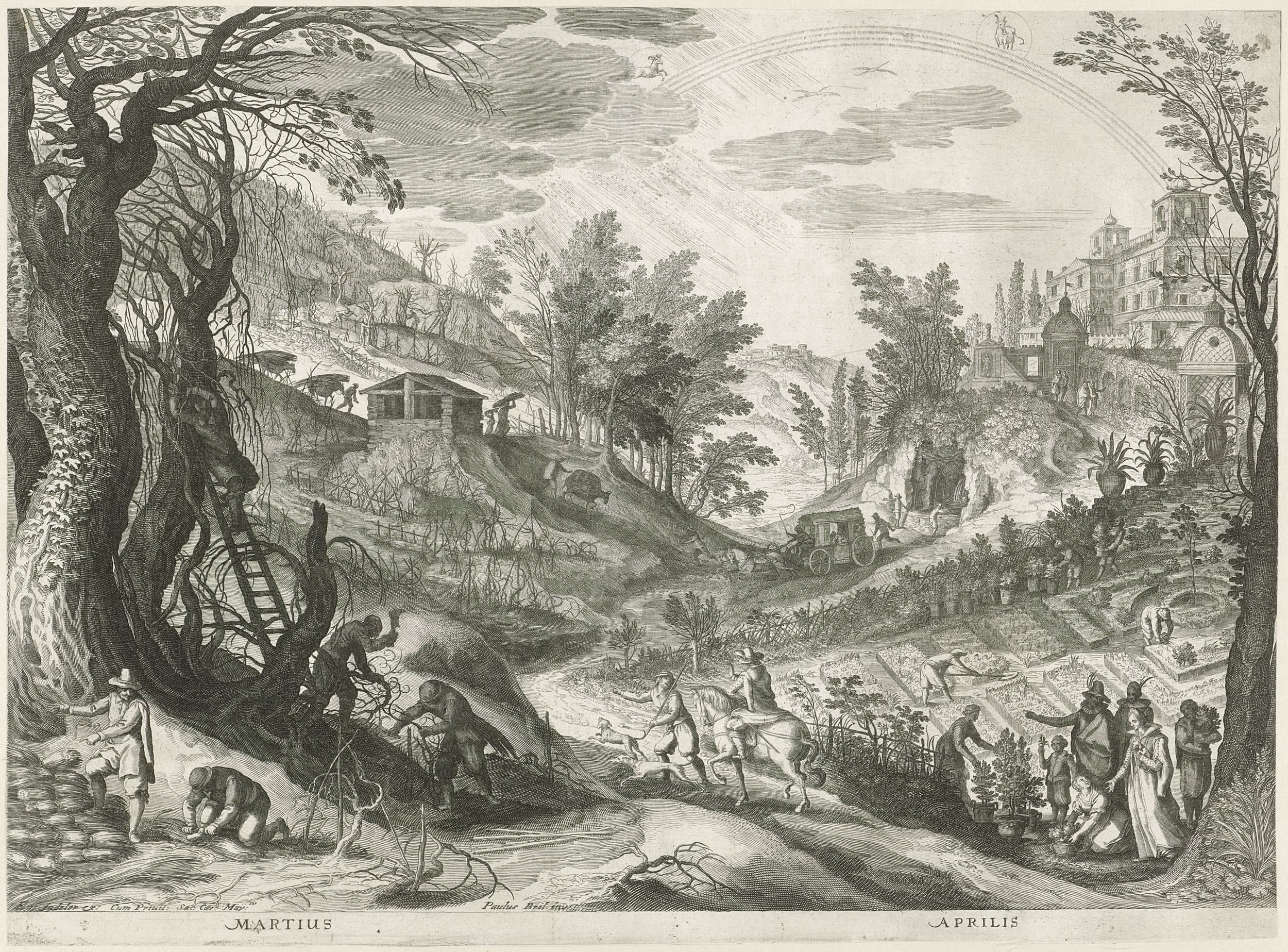 Italiaans landschap tijdens de maanden maart en april. Links op de voorgrond wordt hout gesprokkeld. Rechts wordt een tuin aangelegd. Op de achtergrond een architectonische tuin. Bovenaan links en rechts de tekens van de zodiak: het sterrenbeeld Ram en het sterrenbeeld Stier.