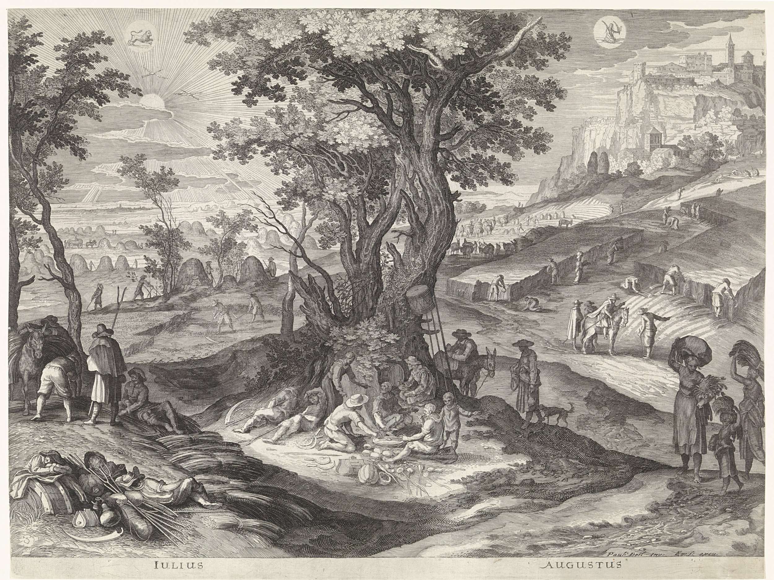 Italiaans landschap tijdens de maanden juli en augustus. Centraal staat het hooien en het maaien van het gras(links en het oogsten van het graan (rechts). In het midden zijn enkele landbouwers juist toe aan hun rustpauze. Bovenaan links en rechts de tekens van de zodiak: het sterrenbeeld Leeuw en het sterrenbeeld Maagd.