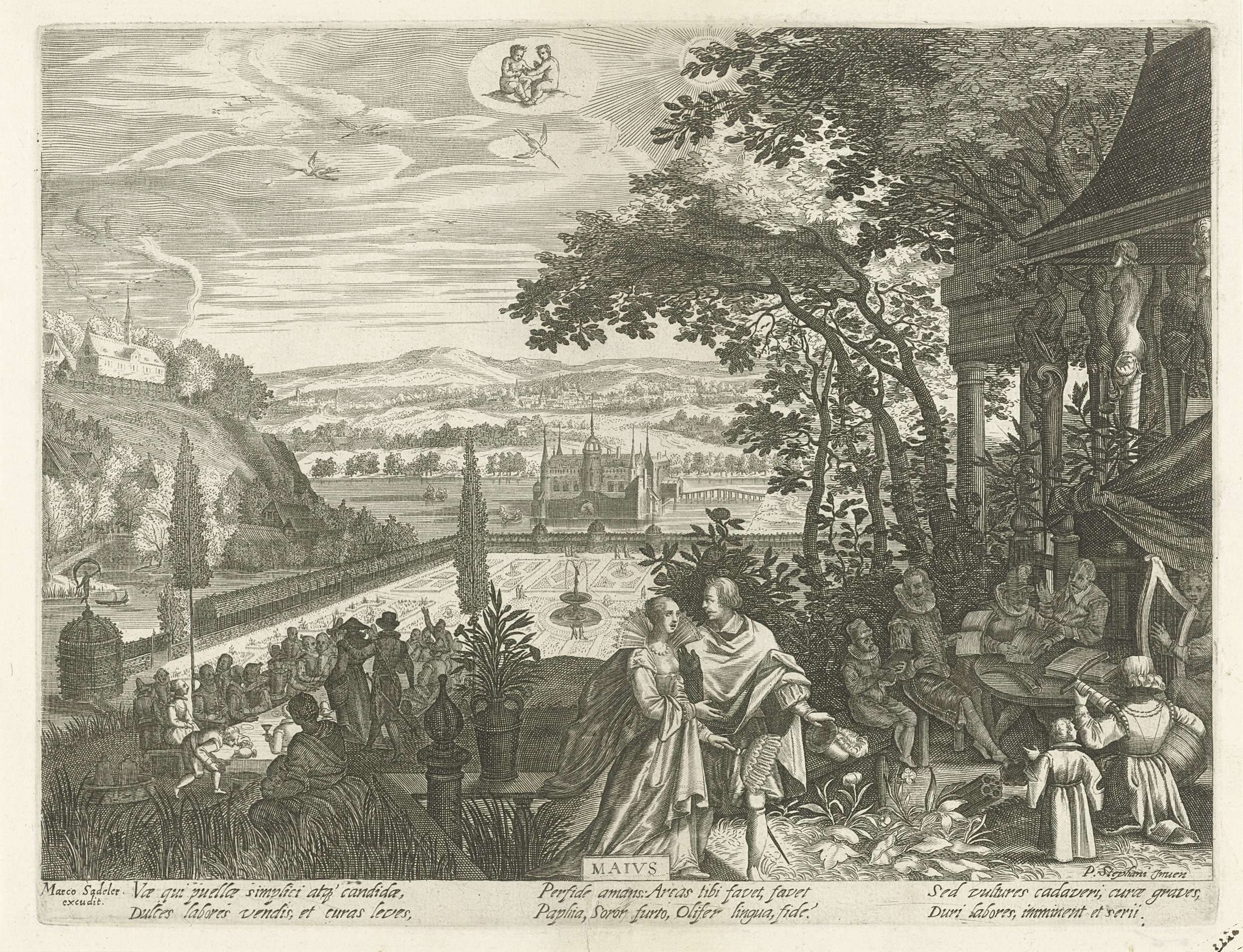 Mei is de maand van de liefde. Rechtsvoor een musicerend gezelschap in een prieel met karyatiden. De harp en luit worden bespeeld, waarbij wordt gezongen uit zangboekjes. Middenvoor een elegant gekleed paar, van voren gezien. Op het tweede plan links een gezelschap aan tafel in een Franse tuin. Op de achtergrond een kasteel. Heuvels in ...