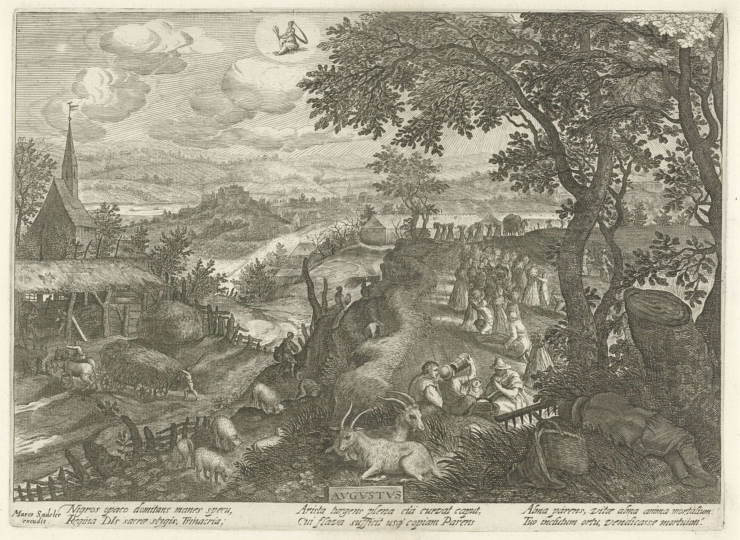 Augustus is de oogstmaand. Rechts de graanoogst. Het koren wordt in schoven gebundeld. Links wordt het op karren vervoerd naar de schuur. Rechts op de voorgrond een groep etende en slapende boeren onder een boom. Heuvelachtig landschap met linksachter een kerkje. In de lucht het sterrenbeeld Maagd. De prent heeft een Latijns onderschrift.