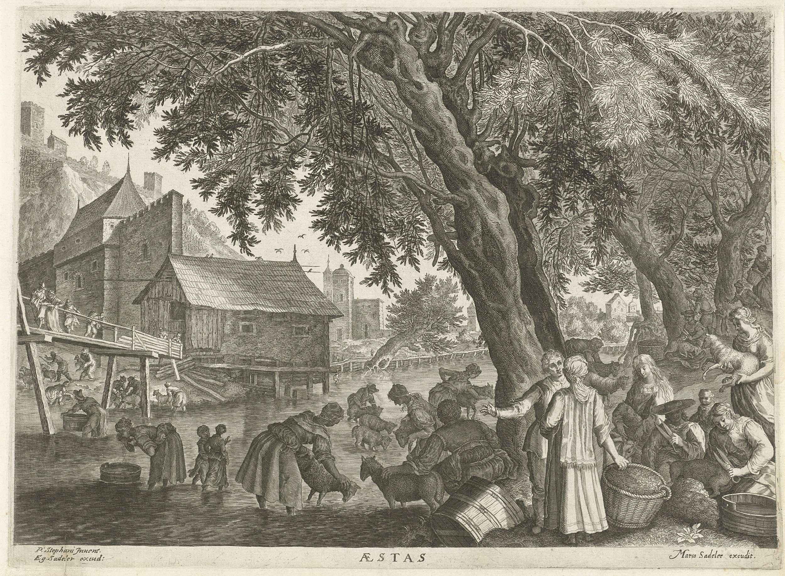 In een rivier langs een dorp worden schapen gewaaen. Op de rechteroever worden ze, onder de bomen, geschoren en wordt de wol in manden vergaard. Links het dorp met een houten brug over het water.