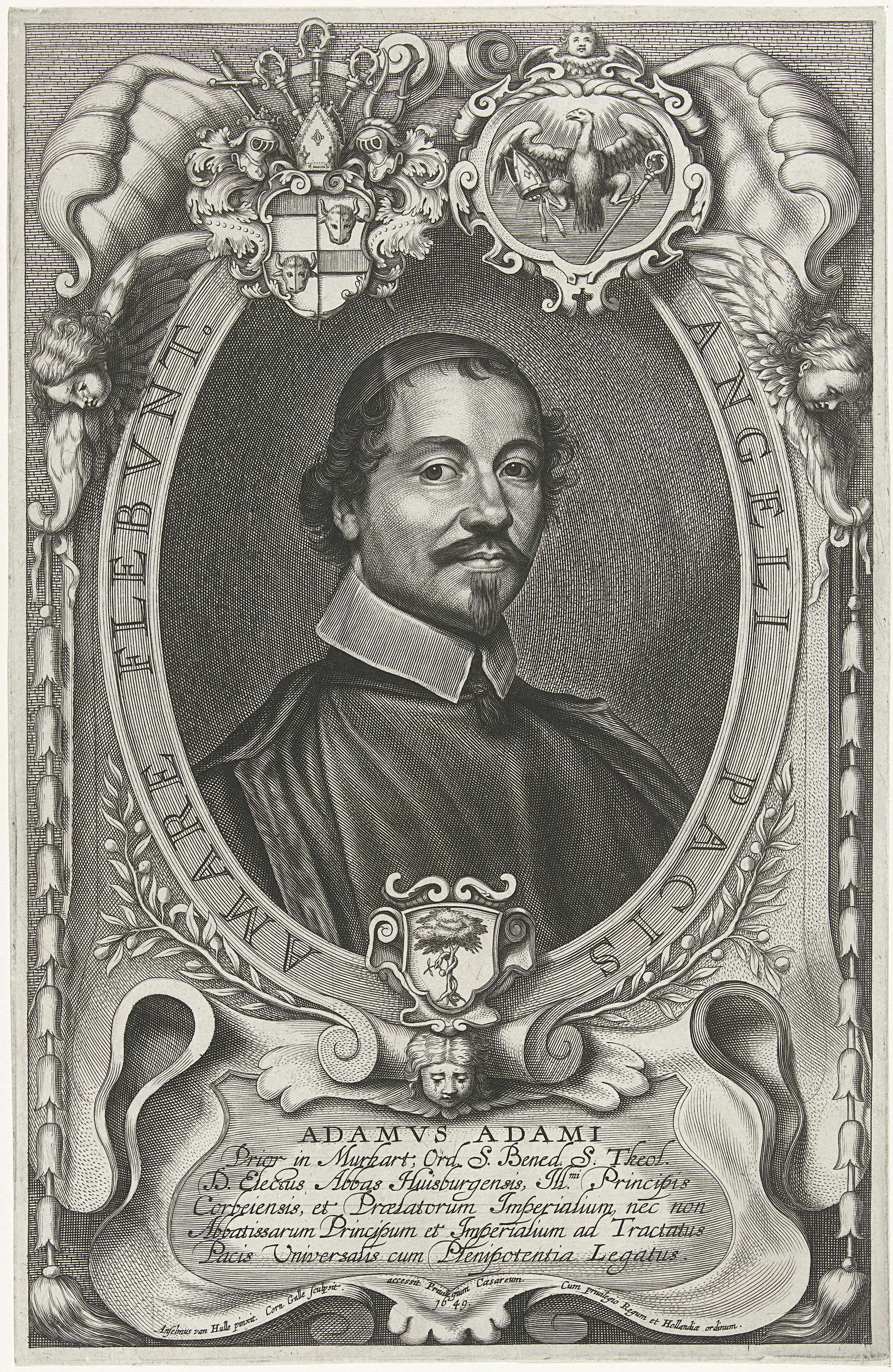 Portret van Adam Adami, afgevaardigde bij de onderhandelingen rond de Vrede van Münster, in ovaal met sierlijst. In de lijst zijn drie wapens verwerkt.