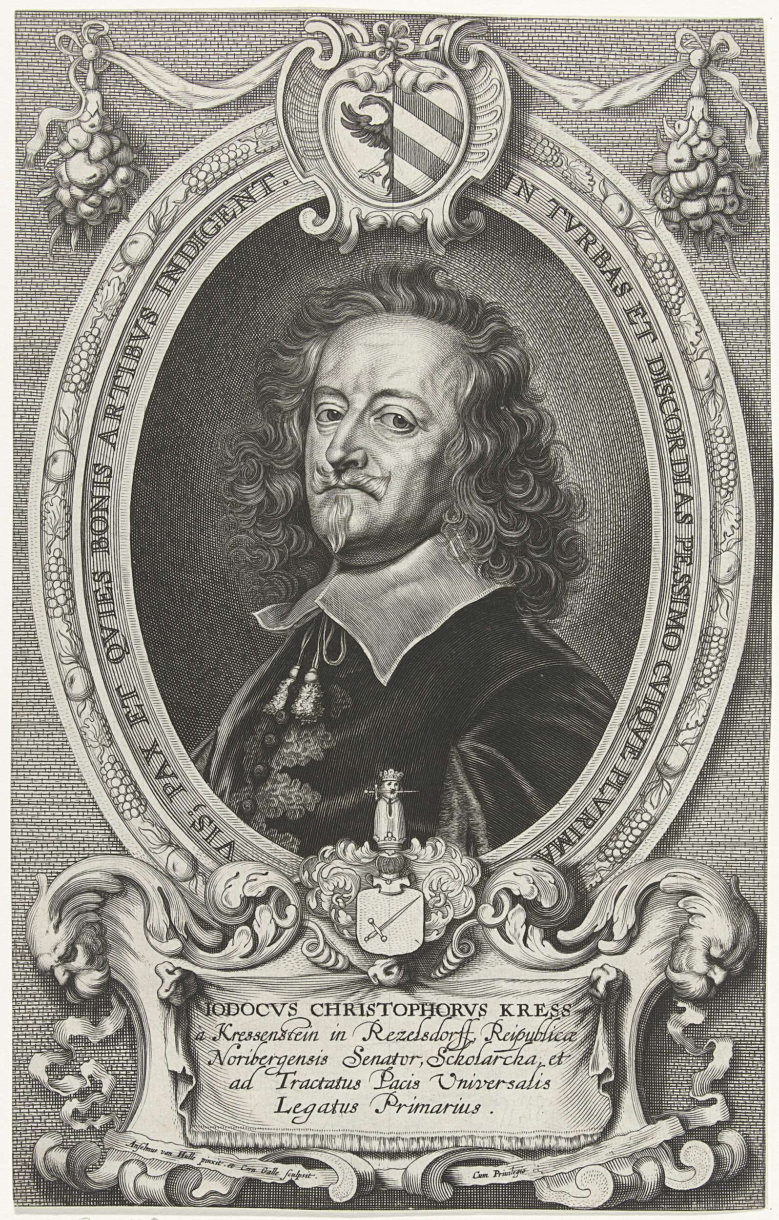 Portret van Jobst Christoph Kress von Kressenstein, in ovaal met randschrift. Boven het portret het wapen van Neurenberg, onder het familiewapen van Kress von Kressenstein.