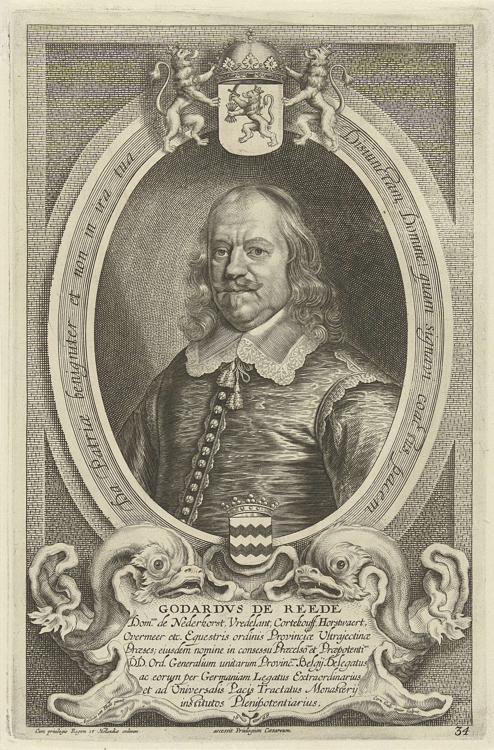 Portret van Godard van Reede van Nederhorst, afgezant van de provincie Utrecht, tijdens de onderhandelingen voor de Vrede van Münster. Portret in ovaal met randschrift. Boven het portret het wapen van de Zeven verenigde provinciën, onder het familiewapen van Van Reede.