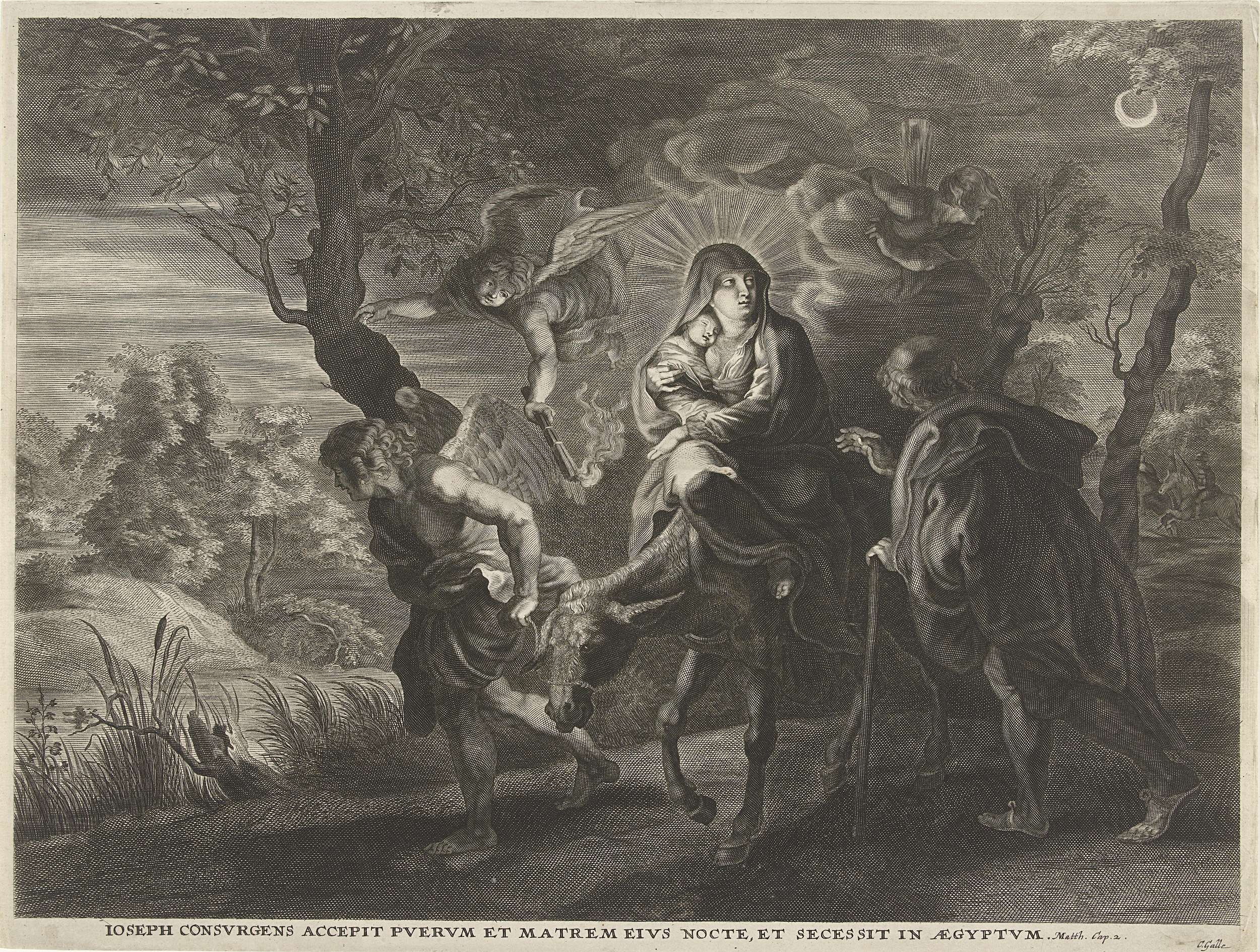 Heilige Familie op de vlucht naar Egypte in een nachtelijk landschap. Maria zit met het Kind op een ezel die door een engel wordt geleid. Josef loopt naast de ezel en kijkt om naar de soldaten die de verkeerde kant opgestuurd zijn. Twee engelen begeleiden het gezelschap.