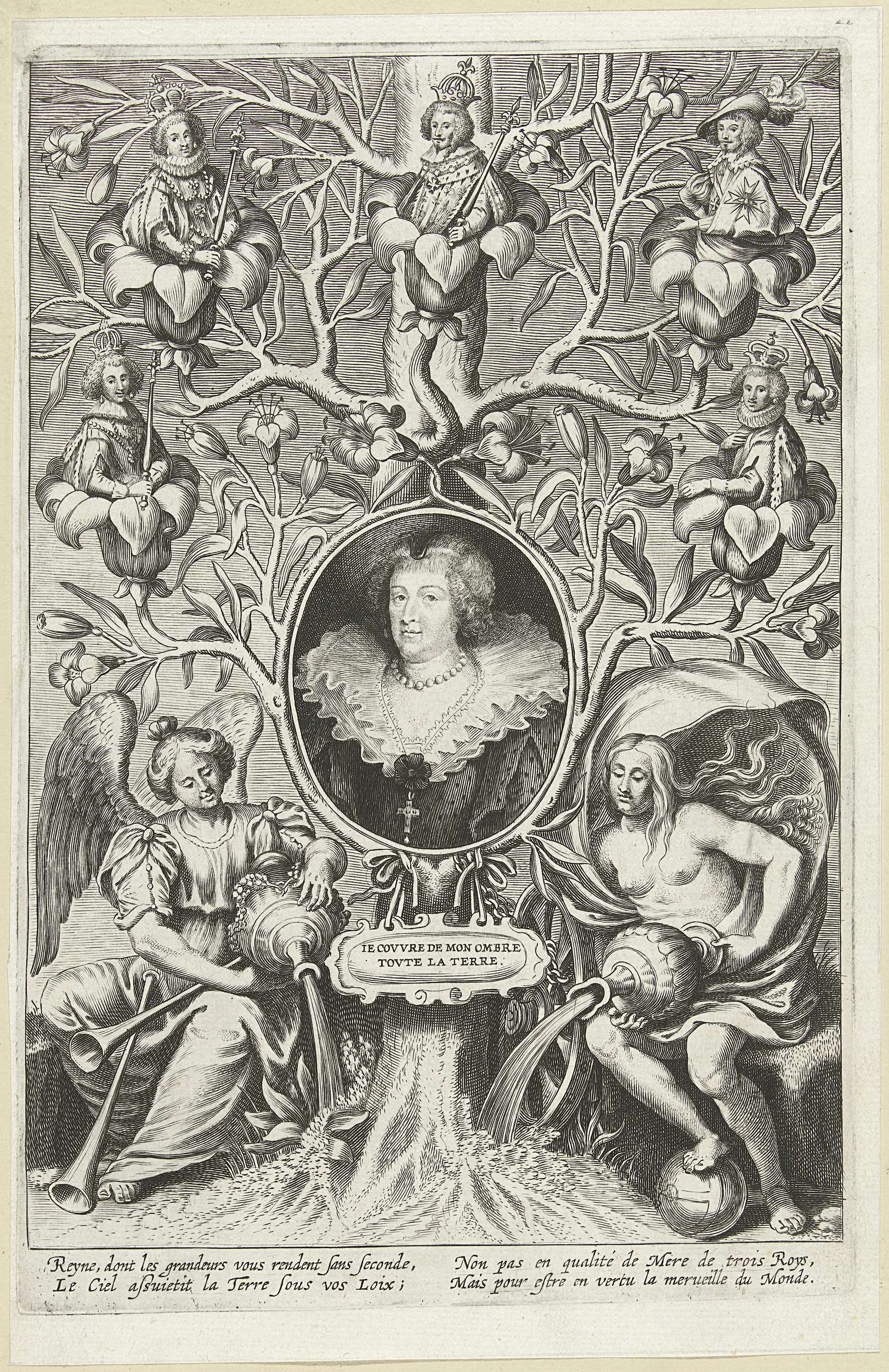 Stamboom met in het midden een ovaal portret van Maria de Medici. Een engel en een Venus wateren de boom uit kruiken. In de bloemen van de boom zitten Marias familieleden. Onder de voorstelling een Franse tekst.