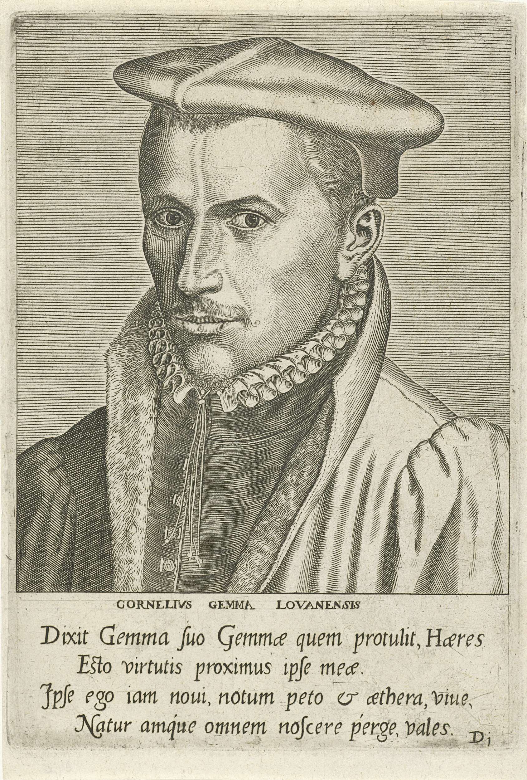 Portret van Cornelius Gemma, de Leuvense arts en en filosoof. Buste naar links. Genummerd D1. De prent heeft een Latijns onderschrift en maakt deel uit van een serie van beroemde Europese geleerden