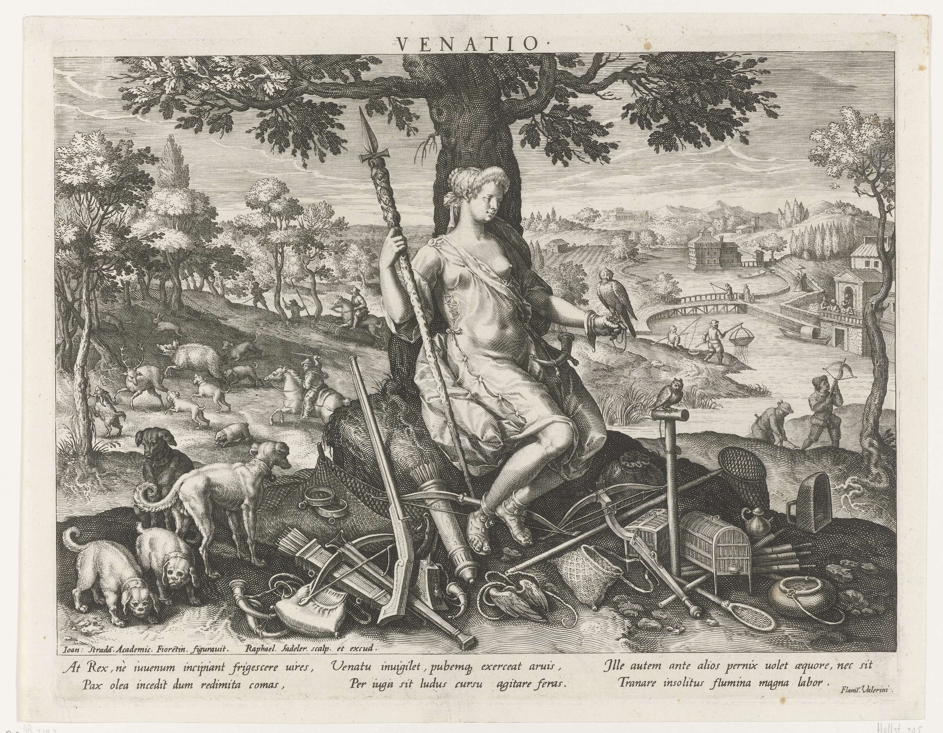 Diana als patrones van de jacht. Ze wordt omringd door jachtwapens (waaronder geweer, kruisboog, jachthonden en jachtvogels). Op de achtergrond links wordt een zwijn opgejaagd door jagers te paard. Op de achtergrond rechts visvangst in een rivier. De prent heeft een Latijns onderschrift met uitleg over het belang van de jacht voor een vorst. De ...