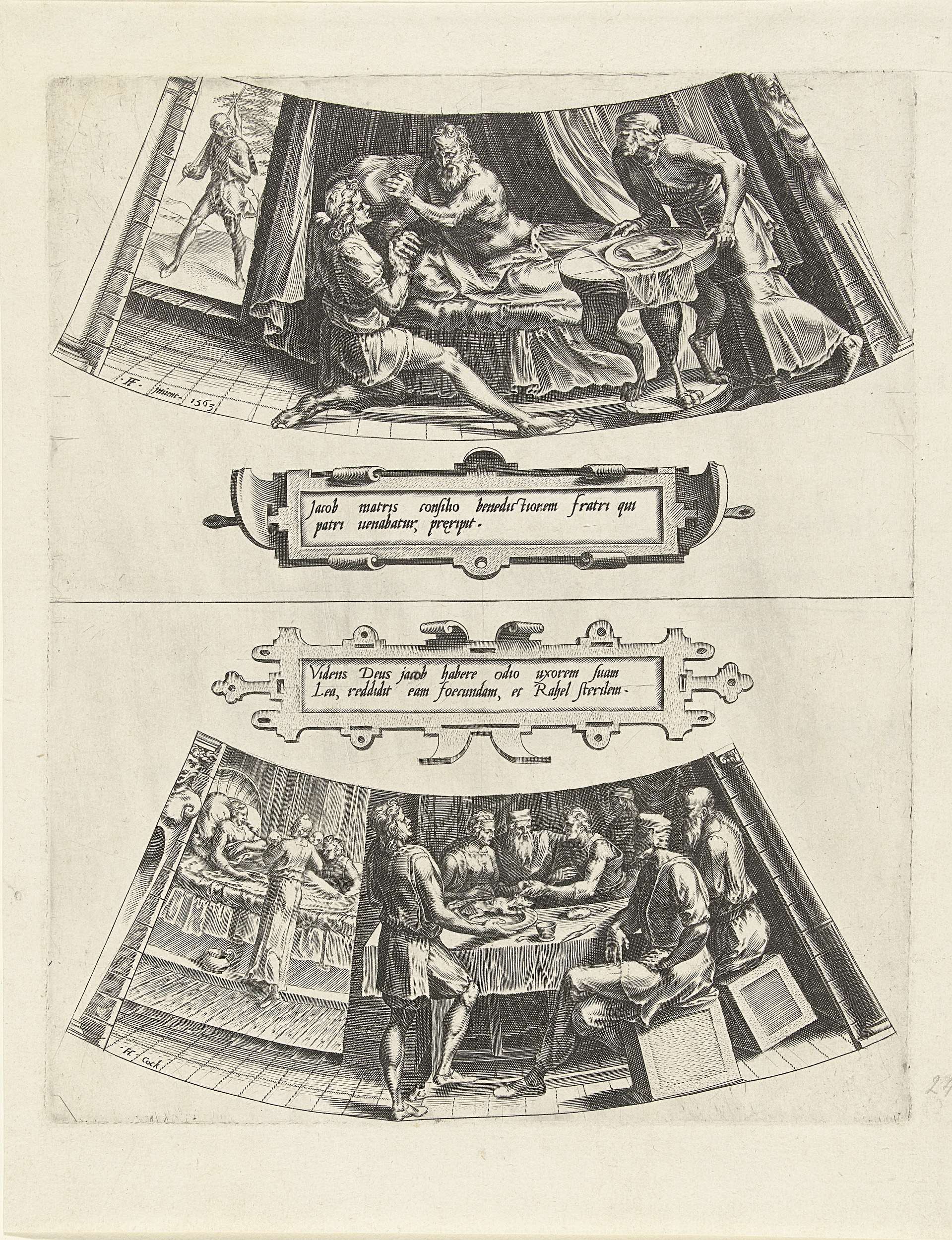 Ornament voor schotelrand. Bovenste helft: Isaak ligt op bed en geeft zijn zegen aan zijn zoon Jakob die voor het bed knielt. Rechts kijkt Rebekka toe. Links in de deuropening Esau. Onderste helft: Rechts de maaltijd voor het huwelijk van Jakob en Lea. Links een doorkijkje naar een slaapkamer met de geboorte van Lea's kind. ...