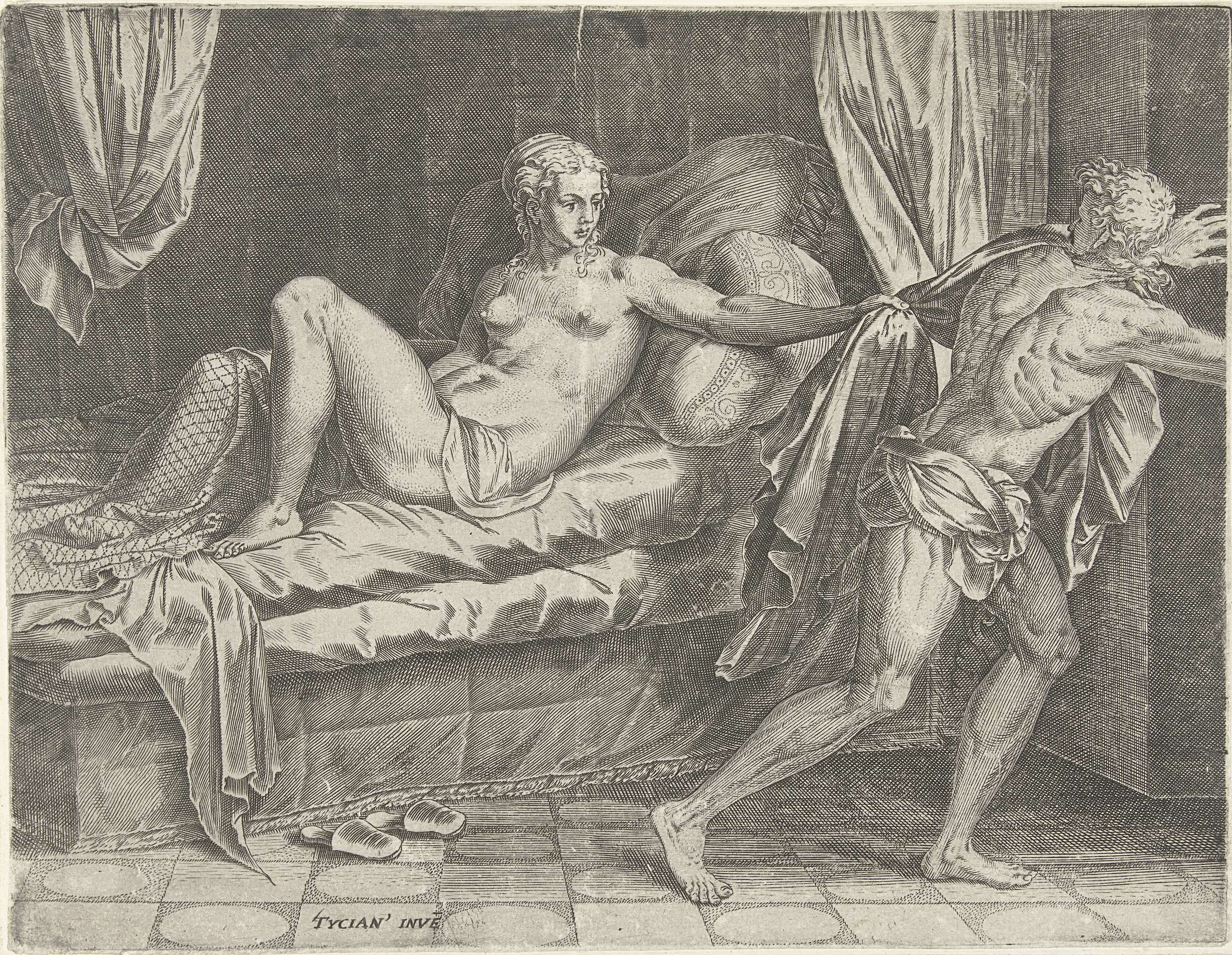 De vrouw van Potifar ligt naakt op een hemelbed. Jozef vlucht van haar weg (naar rechts) en wordt door haar bij zijn mantel vastgegrepen.