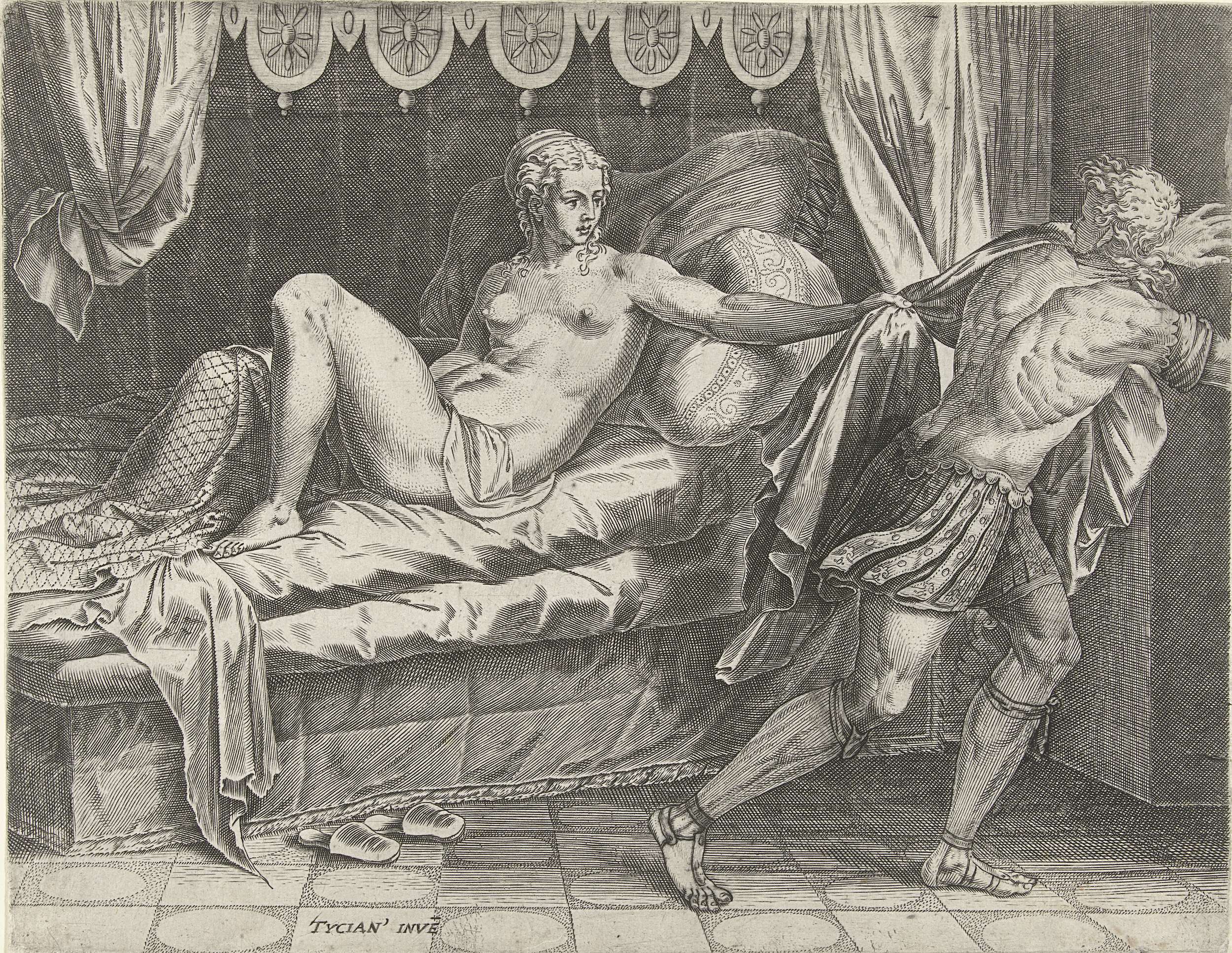 De vrouw van Potifar ligt naakt op een hemelbed. Jozef vlucht van haar weg (naar rechts) en wordt door haar aan zijn mantel vastgehouden.