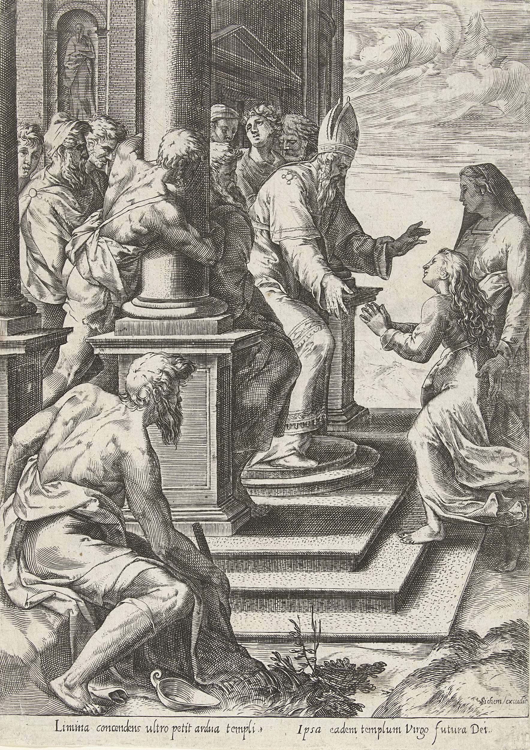 Maria wordt door haar moeder Anna begeleidt naar de tempel. Voor de deur van de tempel wordt zij opgewacht door de hogepriester Zacharias.