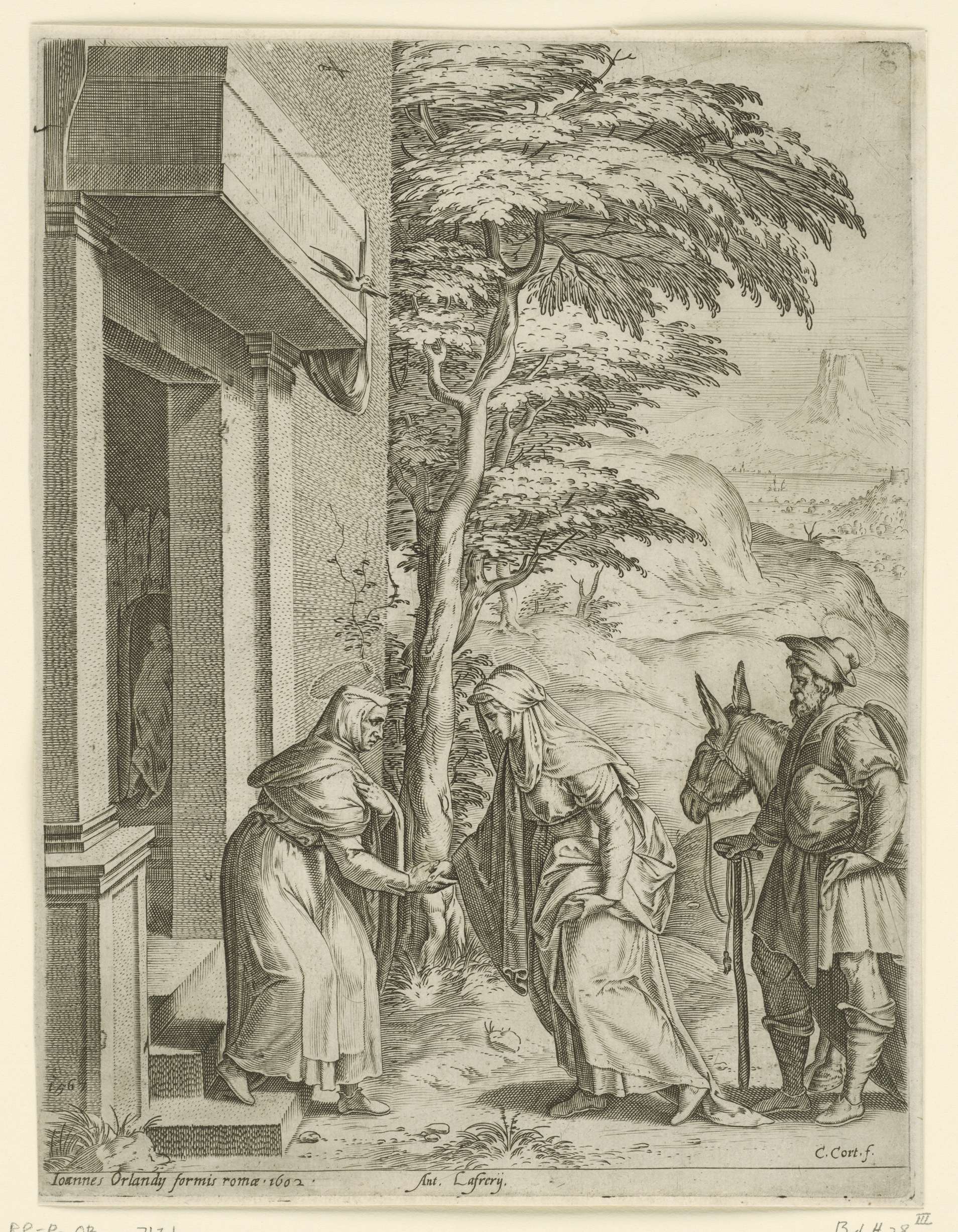 Maria en Jozef komen aan bij het huis van Maria's nicht Elisabet. Maria en Elisabet geven elkaar een hand voor de deuropening en begroeten elkaar vormelijk. Achter Maria staat Jozef met een ezel.