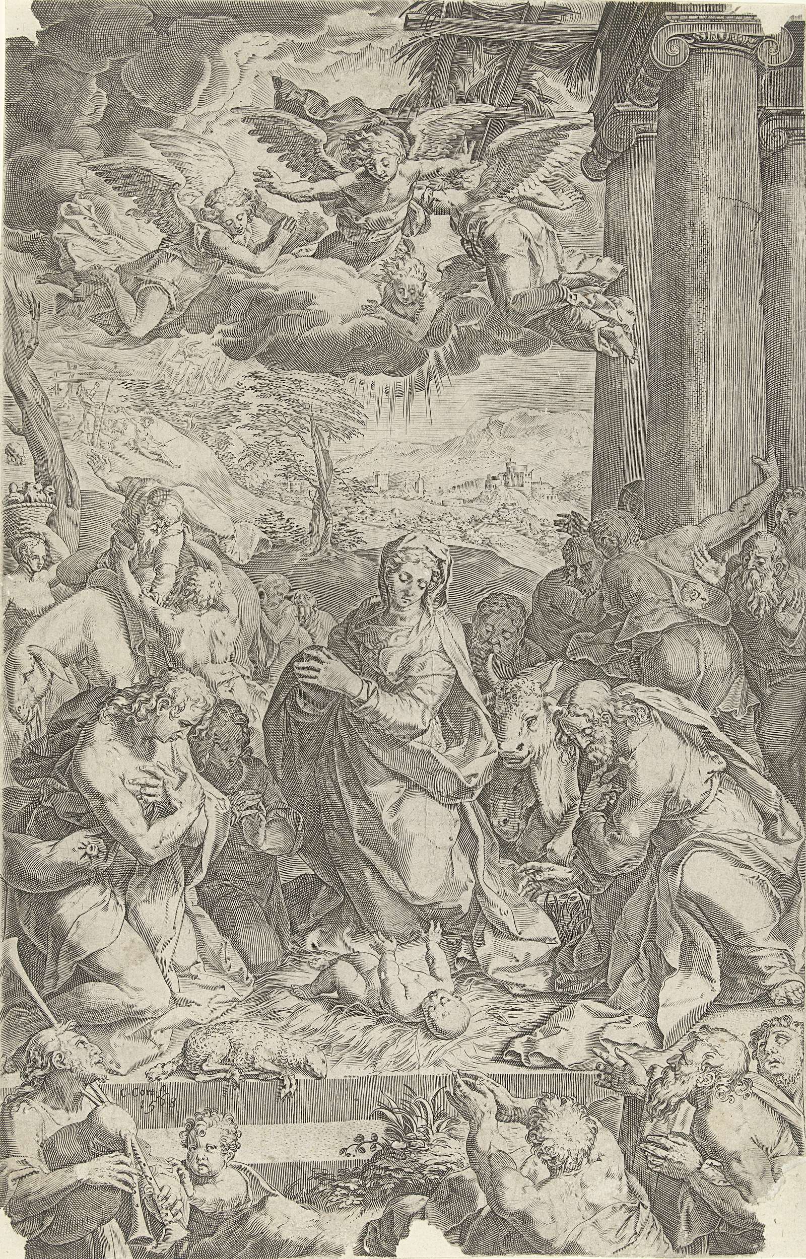 In het midden zitten Maria en Jozef geknield voor het Kind dat op een bundel stro op de grond ligt. Naast Christus ligt een lam. Een groep herders knielt in aanbidding eromheen. De herder linksvoor bespeelt een doedelzak. In de lucht engelen op een wolk. Rechtsachter de zuilen van een antiek gebouw. Linksachter, in een ...