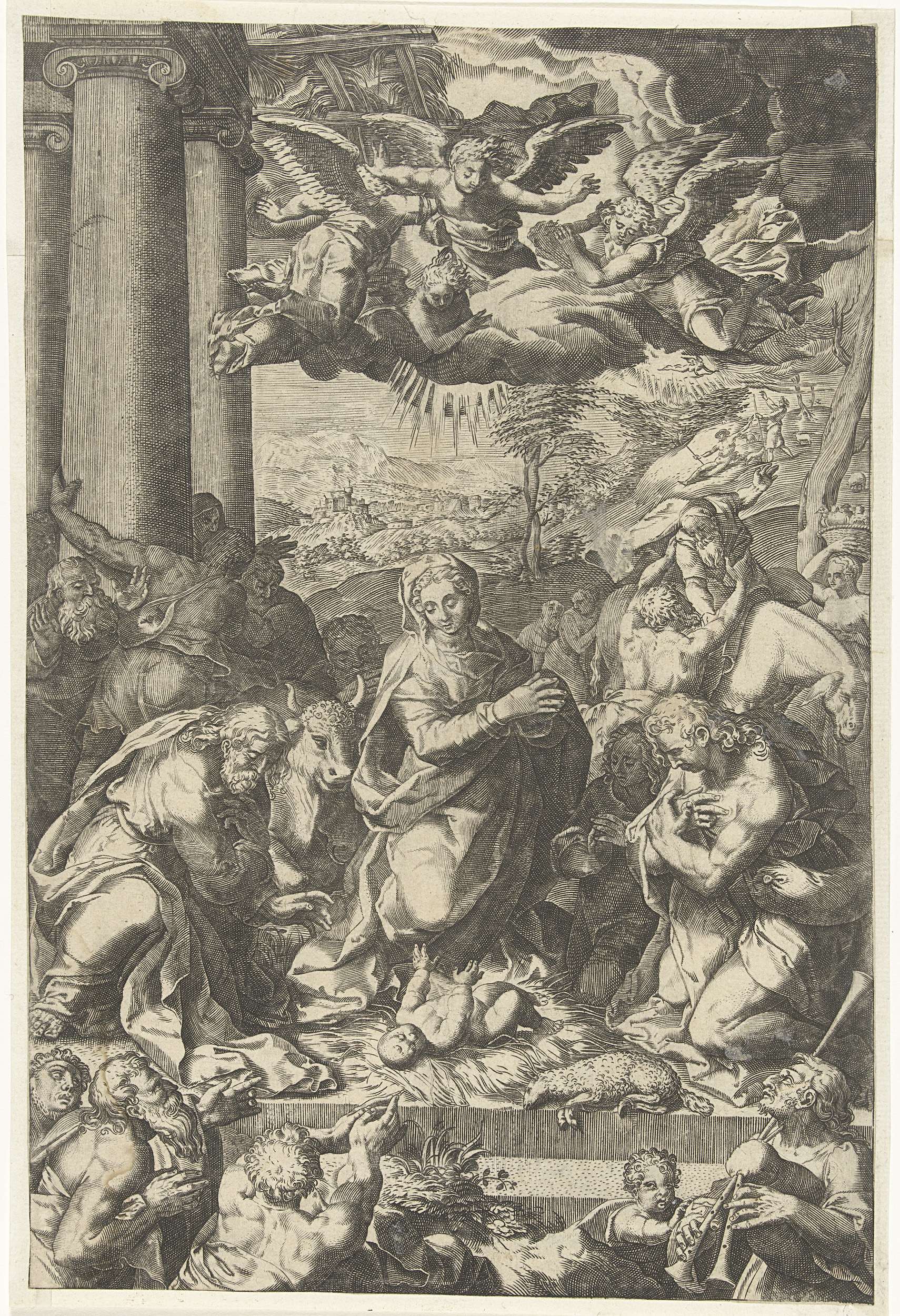 In het midden zitten Maria en Jozef geknield voor het Kind dat op een bundel stro op de grond ligt. Naast Christus ligt een lam. Een groep herders knielt in aanbidding eromheen. De herder rechtsvoor bespeelt een doedelzak. In de lucht engelen op een wolk. Linksachter de zuilen van een antiek gebouw. Rechtsachter, in een ...