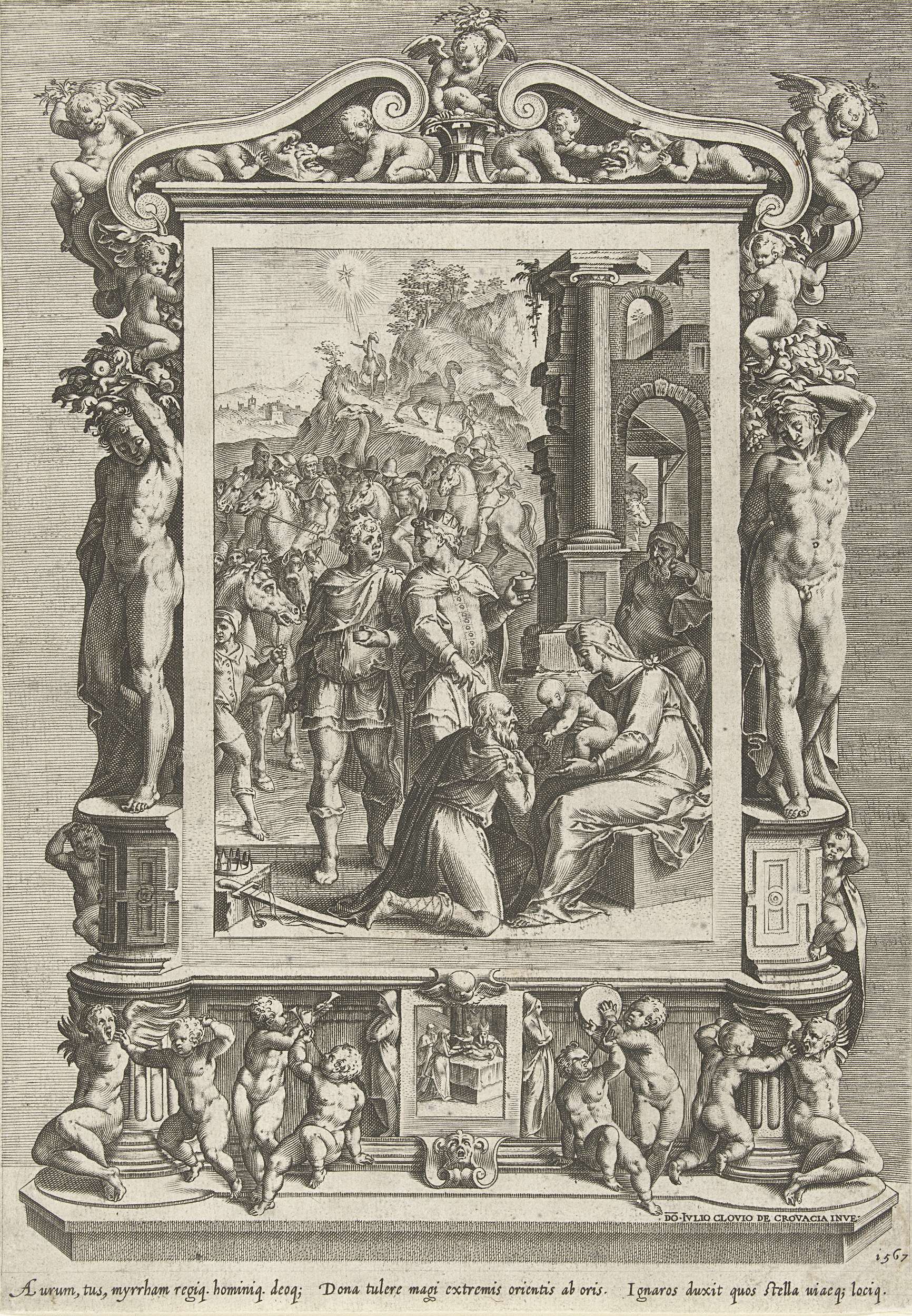 Aanbidding door de koningen in architecturale omlijsting met putti en musicerende engelen. Rechts Jozef en Maria met het Kind op schoot voor een antiek gebouw. De drie koningen bieden geschenken aan. De voorste koning zit geknield, de twee anderen staan. Achter hen een stoet met ruiters en kamelen. In de omlijsting een plaquette met de ...