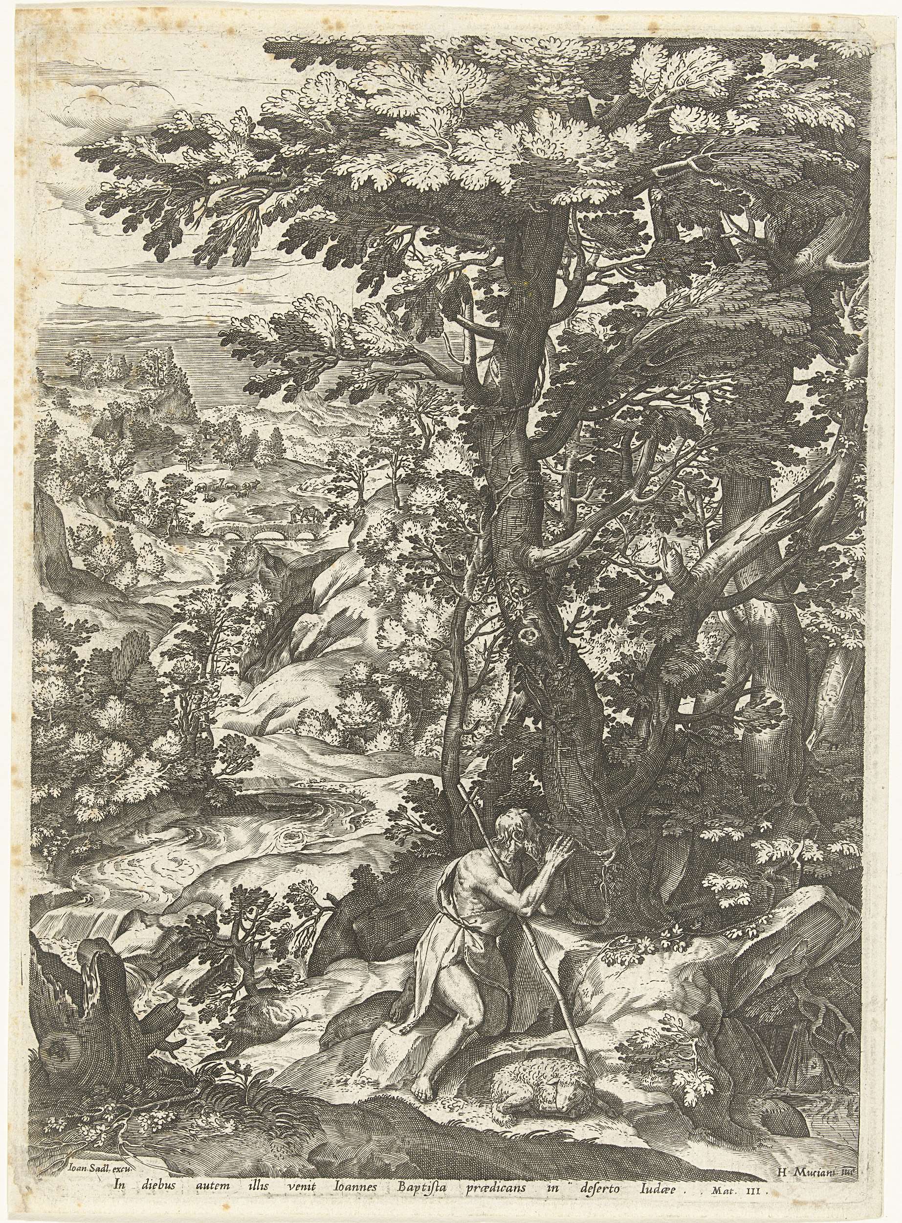 Glooiend rivierlandschap met biddende Johannes de Doper. Naast de knielende figuur ligt een lam.