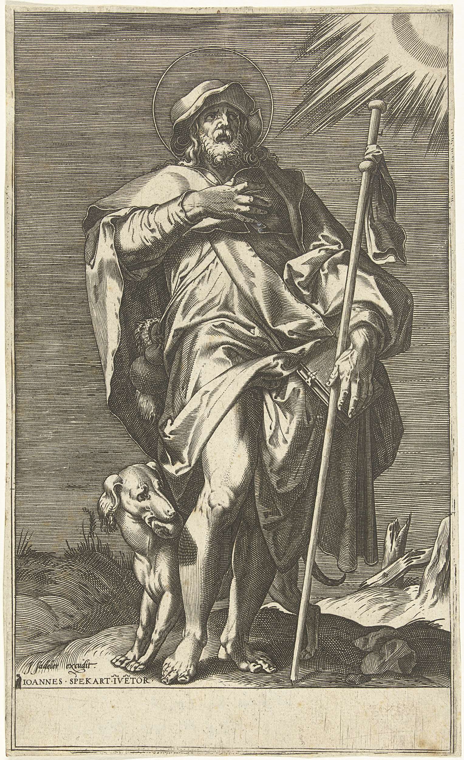 De heilige Rochus staand met een pelgrimsstaf. Achter zijn benen schuilt een hond met een appel in zijn bek. De hond bracht Rochus dagelijks vers eten toen hij aan de pest leed.