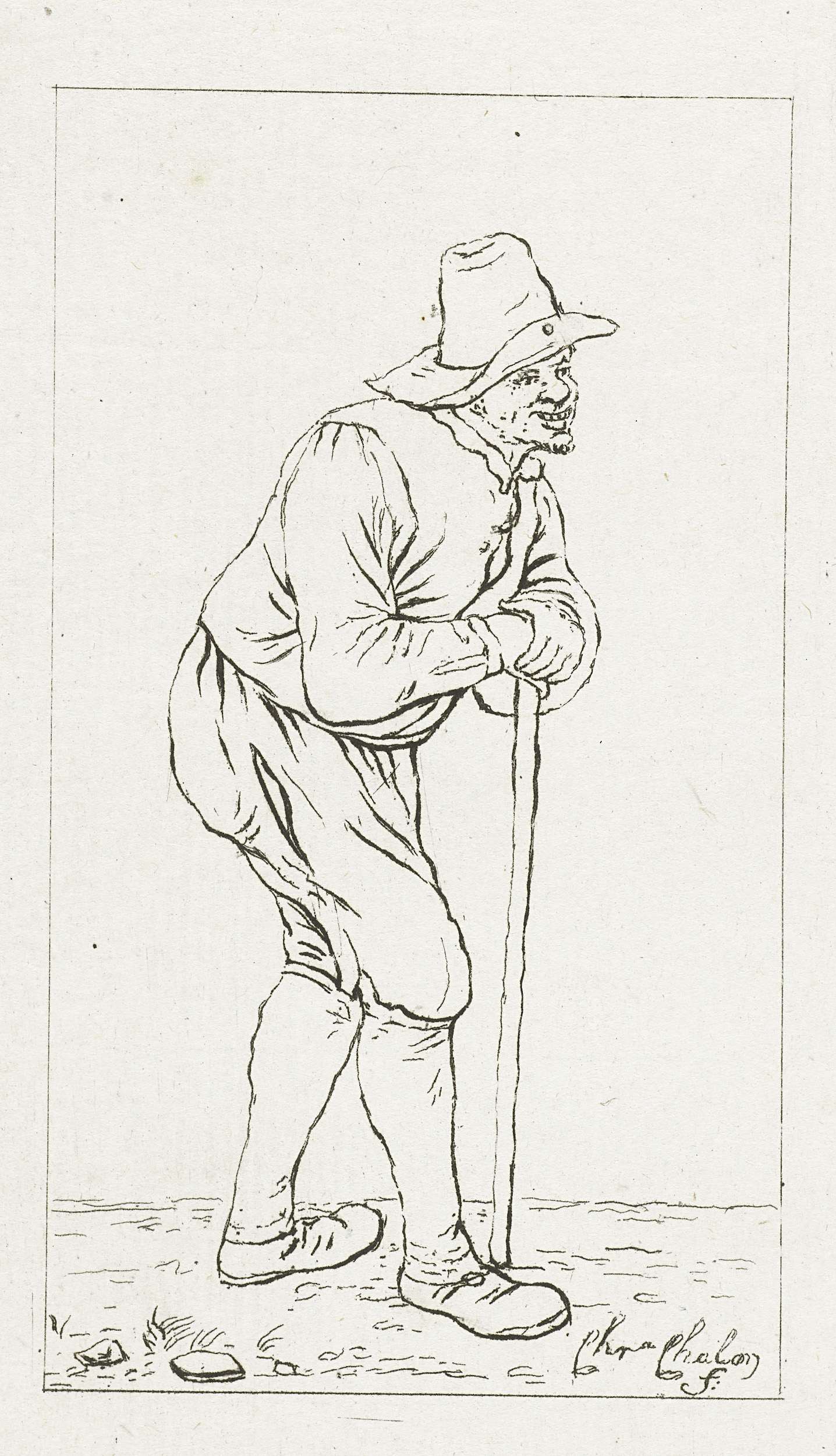 Een boer leunt op de stok, profiel naar rechts. Hij grijnst.