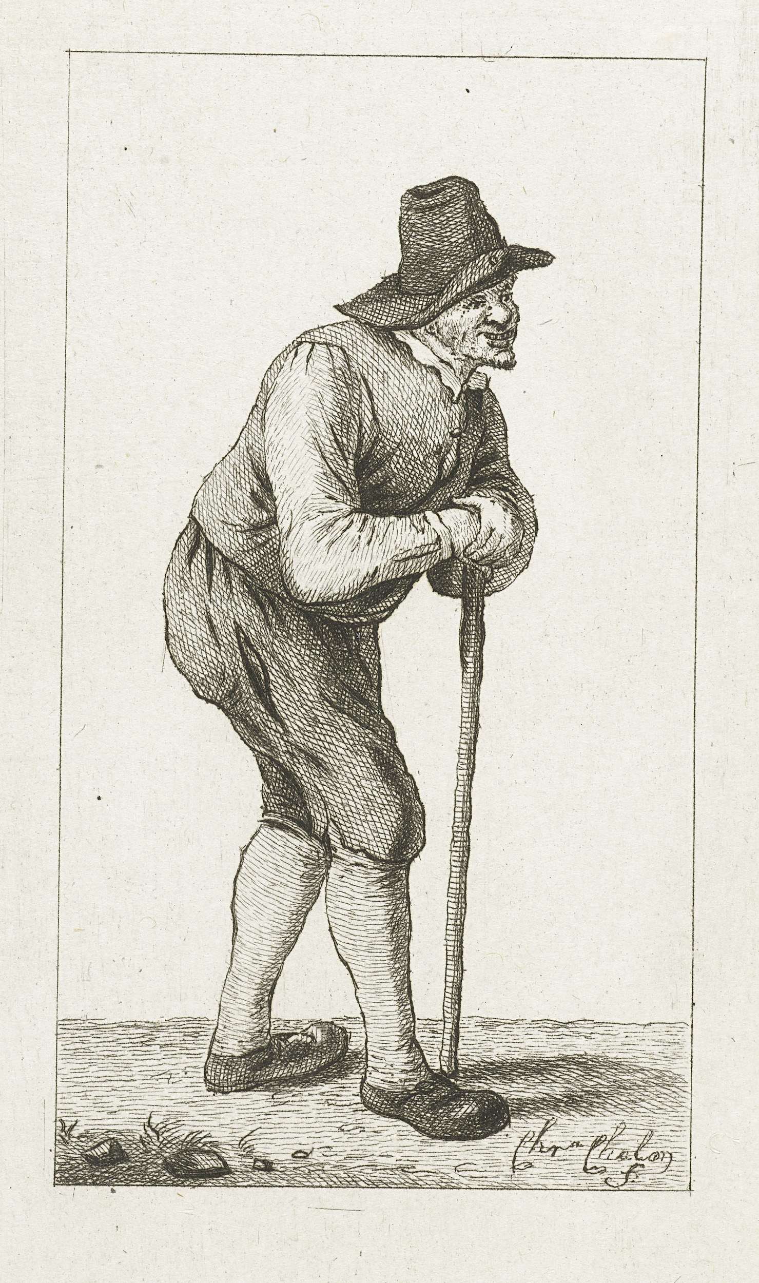 Een boer leunt op de stok, profiel naar rechts. Hij grijnst.
