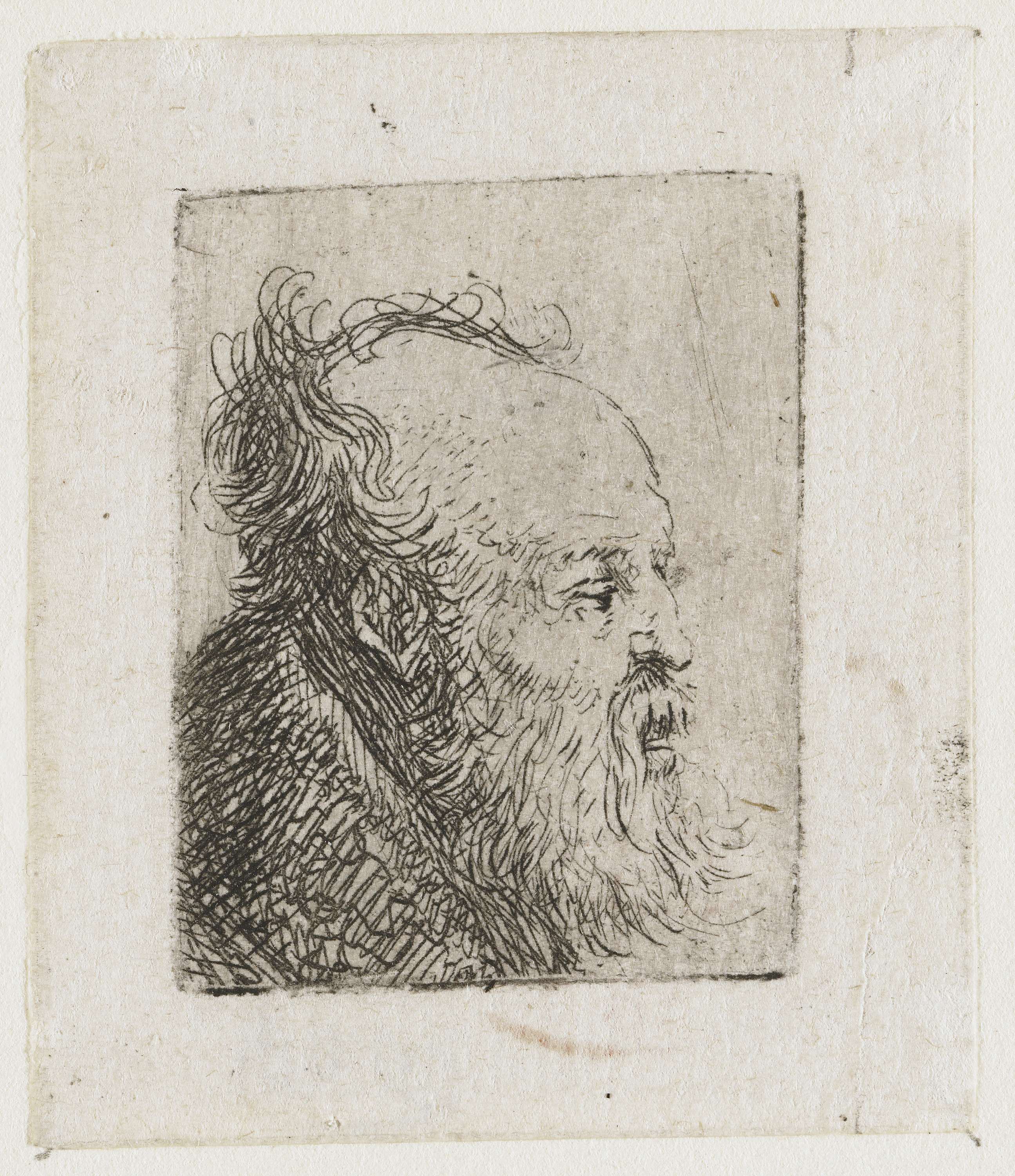 Opnieuw vijf kleine manskopjes, maar nu is zeker dat ze niet als losse prentjes zijn ontstaan. Oorspronkelijk stonden ze allemaal op een en dezelfde koperplaat. Nadat Rembrandt die plaat had verknipt, voltooide hij de etsjes afzonderlijk. Deze werkwijze was ongewoon en ook dat karakteriseert Rembrandt, die als kunstenaar wel vaker de ongebaande paden koos.