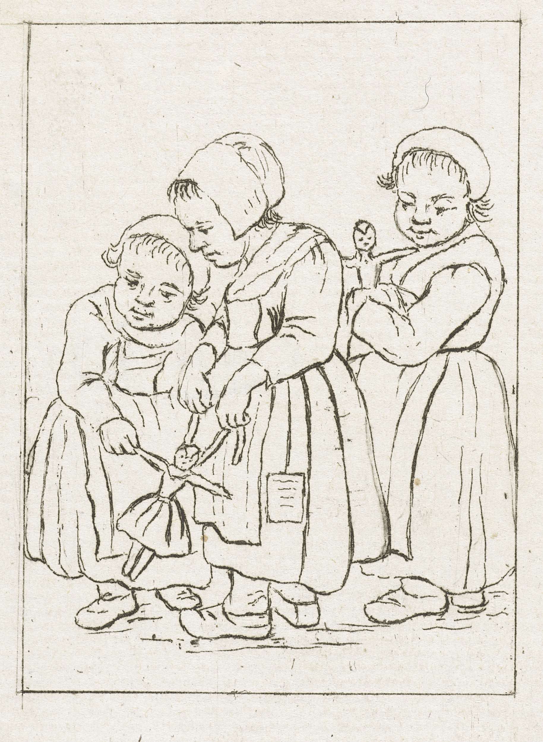 Drie meisjes spelen met poppen. Een meisje houdt een pop in haar handen. Naast haar spelen de andere twee meisjes met een pop.