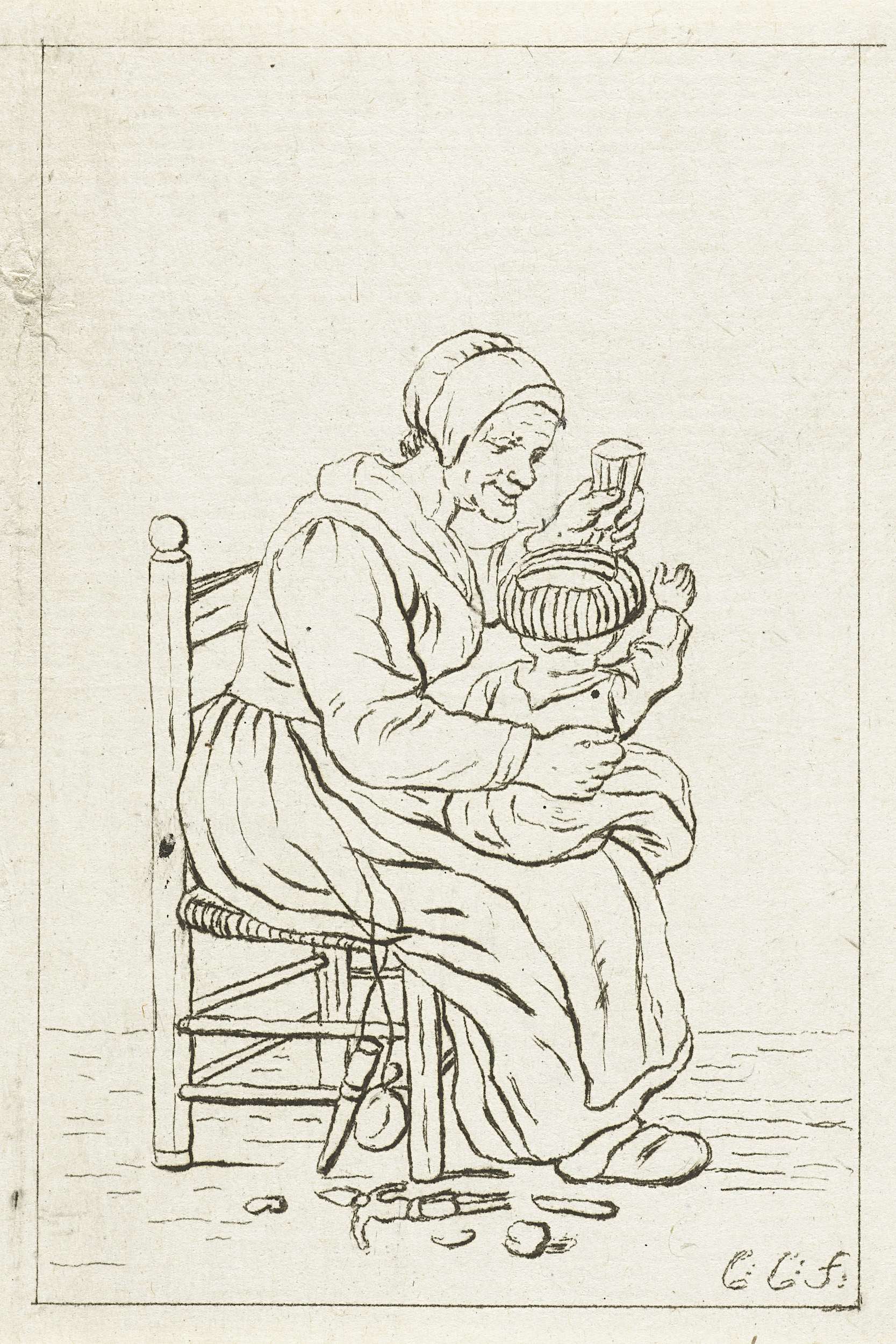 Moeder met kind op de schoot. Ze probeert het kind uit een beker te laten drinken. Op de grond wat speelgoed. Profiel naar rechts.