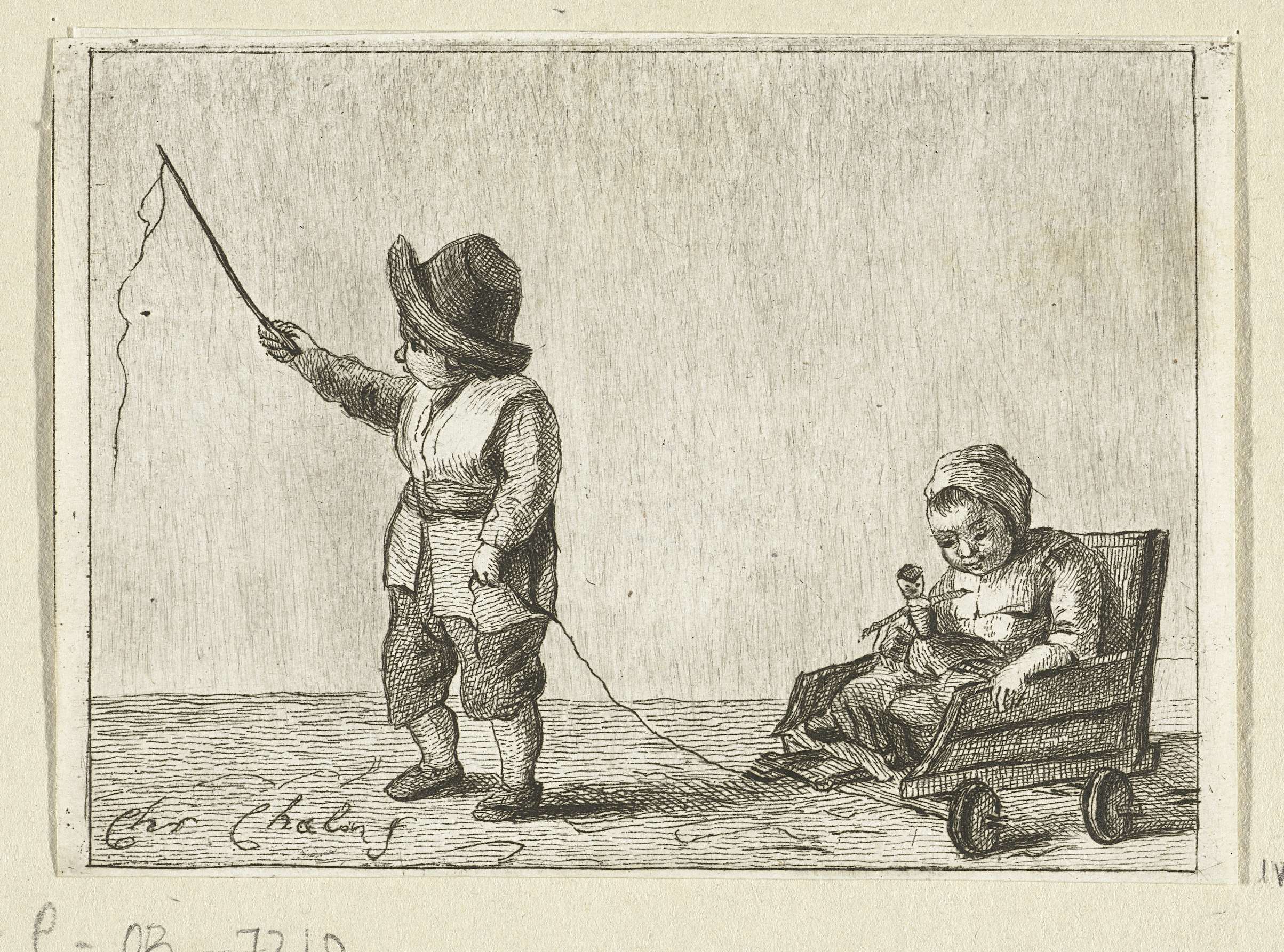 Een jongetje en een meisje spelen koetsier en passagier. De jongen staat voor een rolkar en heeft een zweepje vast. Hij trekt de kar vooruit. Zijn zusje zit in de kar en speelt met een popje.