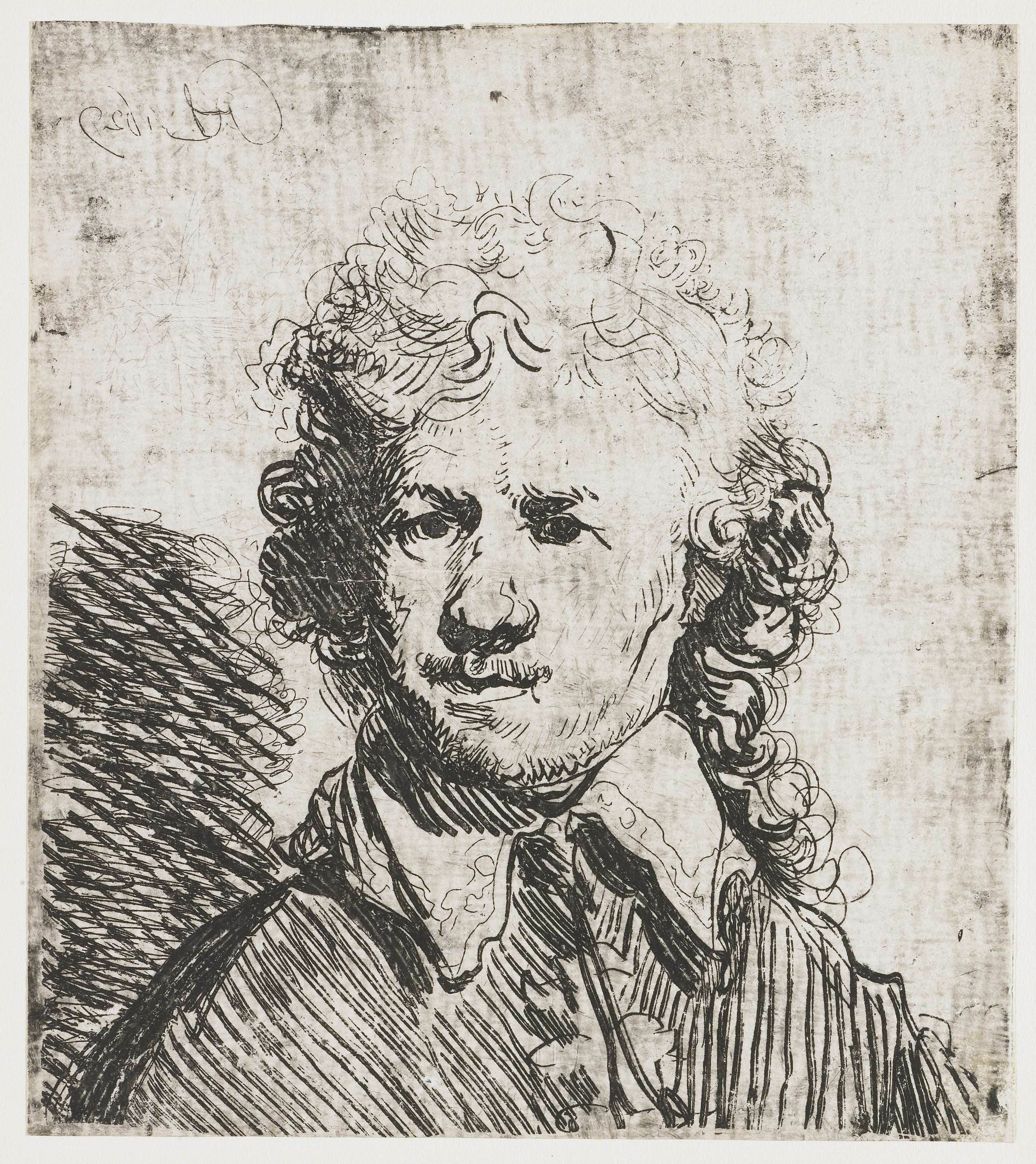 Dit zelfportret uit 1629, een van Rembrandts eerste, toont zijn ambitie en experimenteerdrift. Hij tekende de voorstelling met grove streken in de etsgrond met een tweepuntig instrument, ongetwijfeld een pen. Dat hij zijn koperplaat echt als tekenblad benaderde, was zeer ongewoon. Het resultaat is overigens niet erg geslaagd en ook het grote formaat overtuigt nog ...
