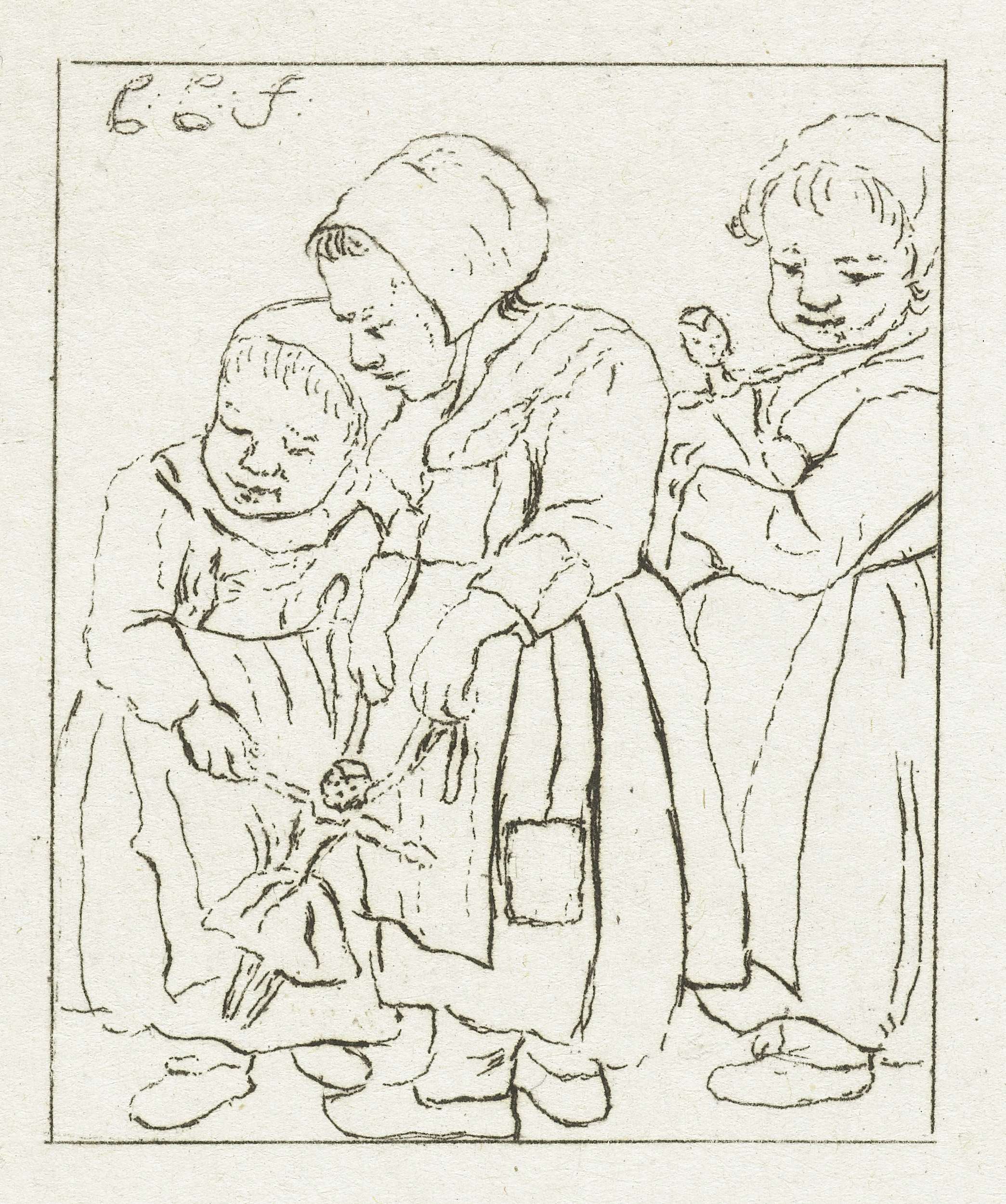 Drie meisjes spelen met poppen. Een meisje houdt een pop in haar handen. Naast haar spelen de andere twee meisjes met een pop.
