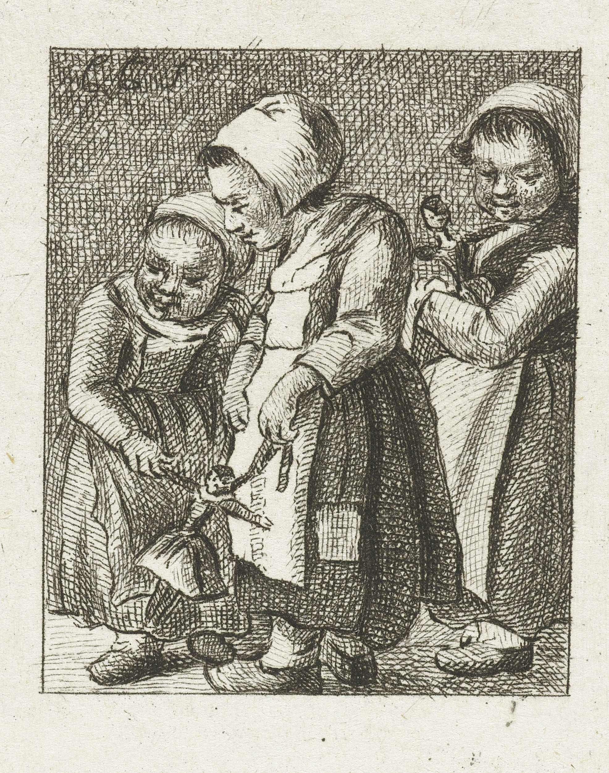 Drie meisjes spelen met poppen. Een meisje houdt een pop in haar handen. Naast haar spelen de andere twee meisjes met een pop.