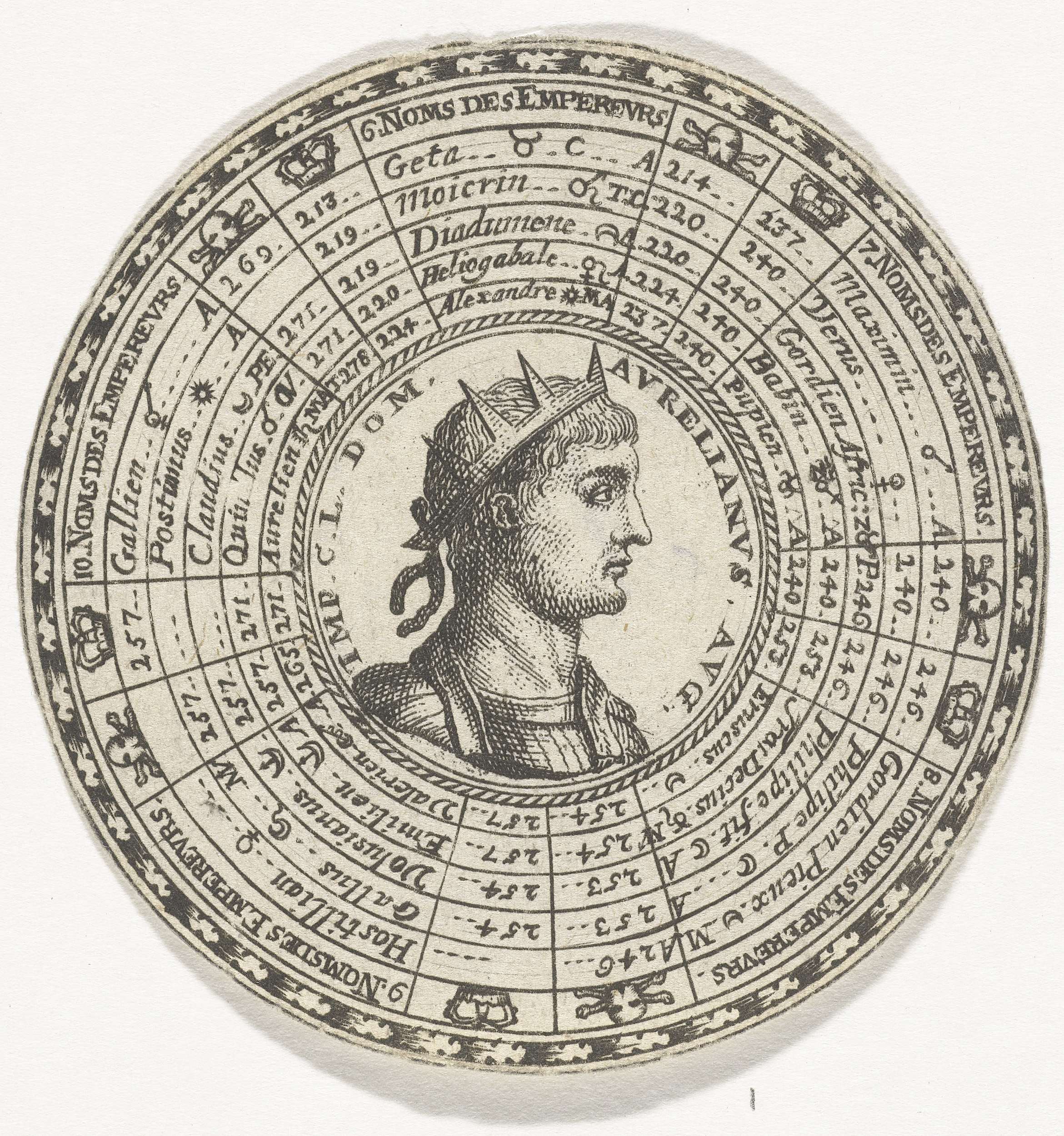 Ontwerp van een ronde penning met, in zes concentrische cirkels, de namen van Romeinse keizers en hun regeringsjaren, beginnende bij keizer Geta en eindigend bij keizer Marcus Aurelius Claudius. In het midden van de penning het portret van keizer Marcus Aurelius Claudius.